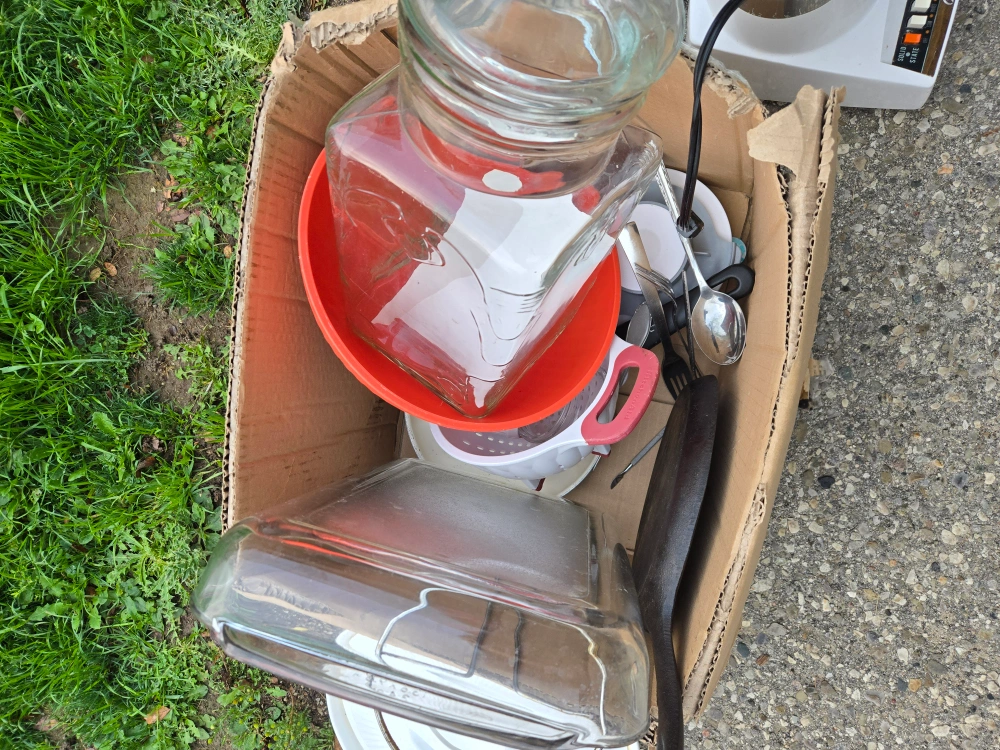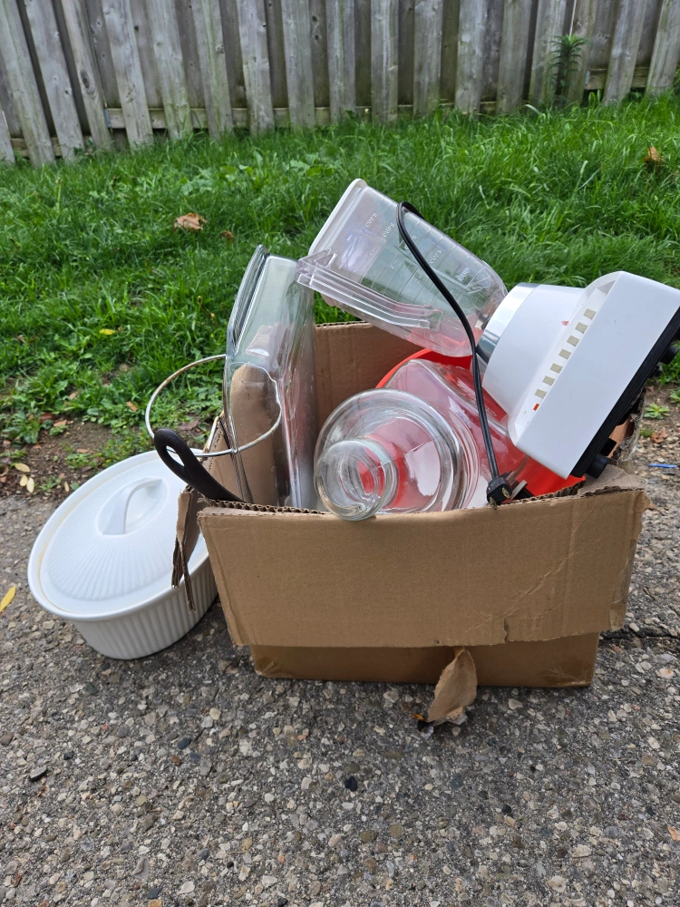 31free box of kitchen stuff including blender, baking pan, cast iron pan and more. must take all.
