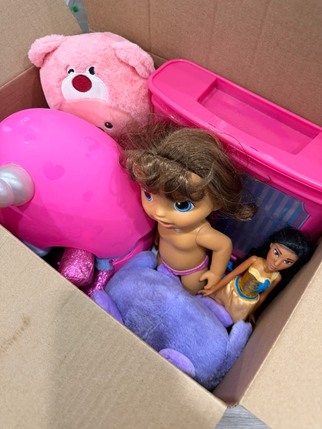 32Selling a box of assorted toys! Includes a pink plush bear, a purple plush toy, and a couple of dolls. Perfect for a young child or collector!