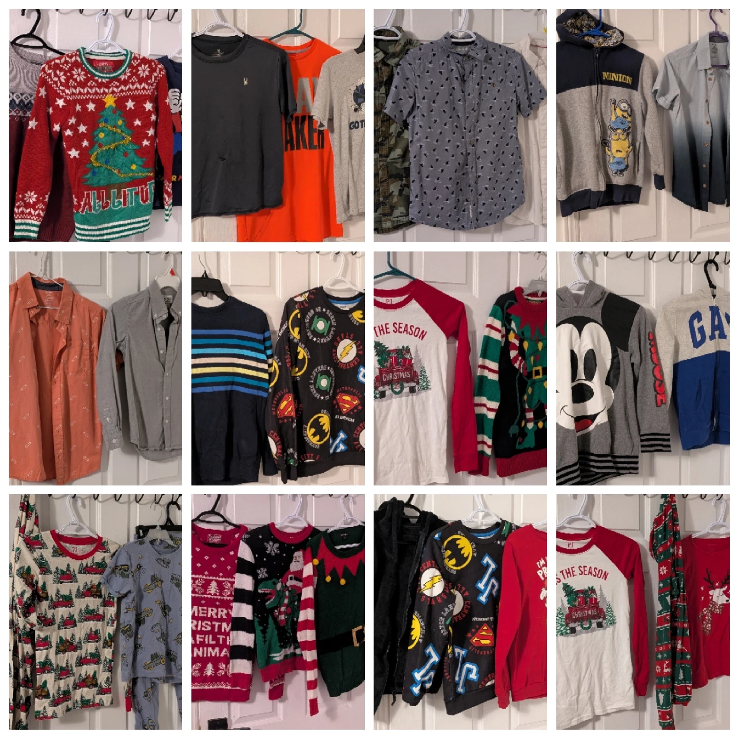 15A mixed lot of clothing items, including sweaters, t-shirts, and hoodies. Assorted brands and sizes. Great for stocking up your wardrobe! Boys size 10-14