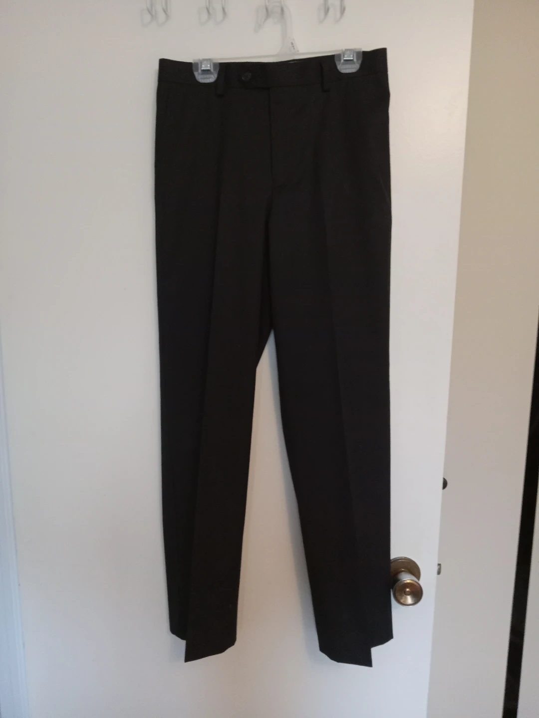 18Boys Size: 14 Reg, 27" Flat Panel front 2 pockets at front 1 back pocket, buttoned All zippers, clips perfect Bought for Grade 8 grad ceremony from the store Tip Top. Never worn again. Excellent condition.