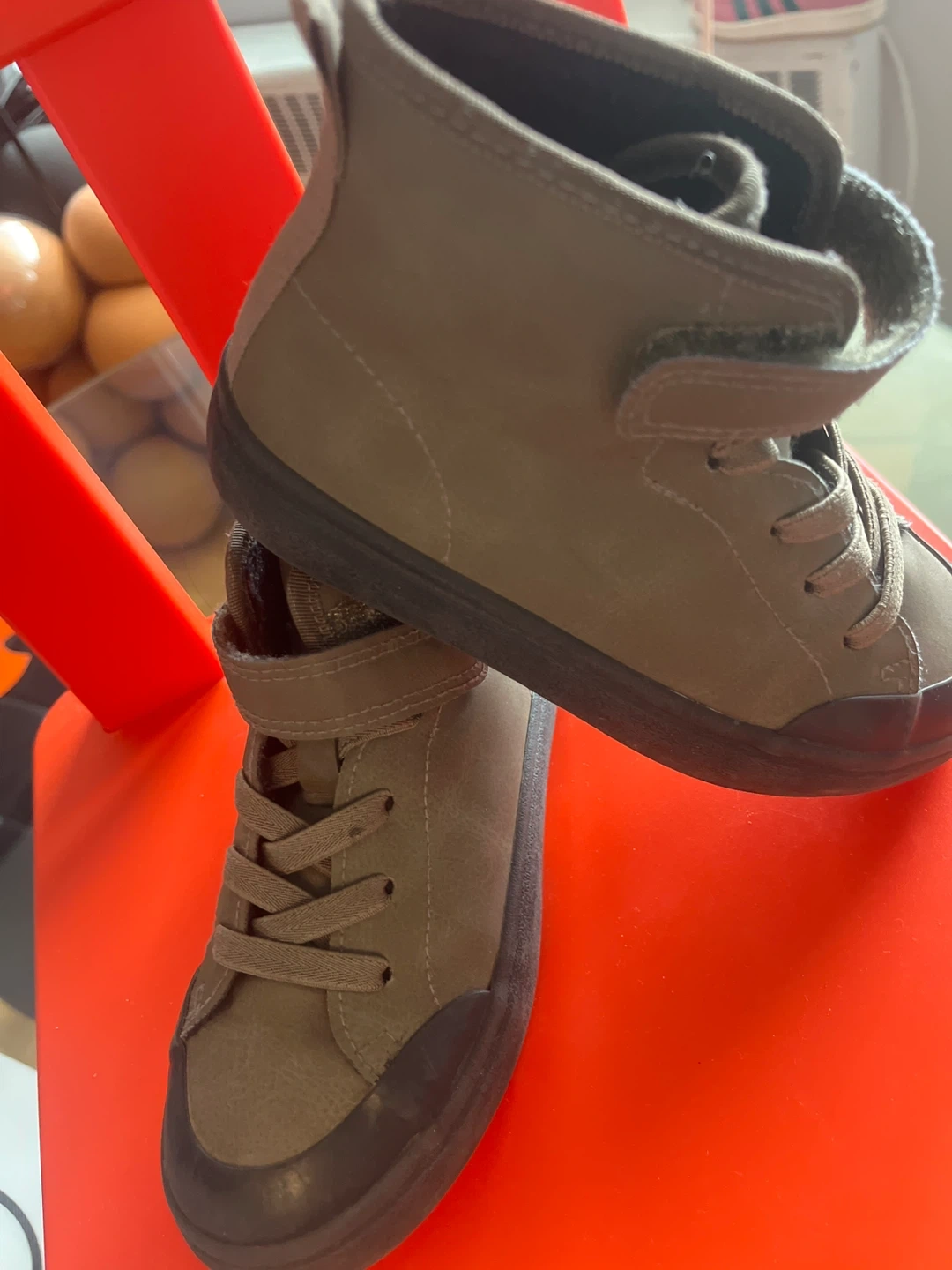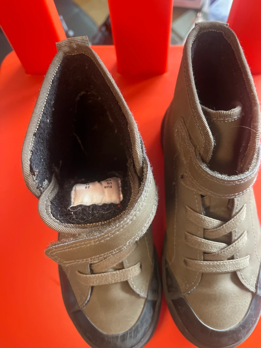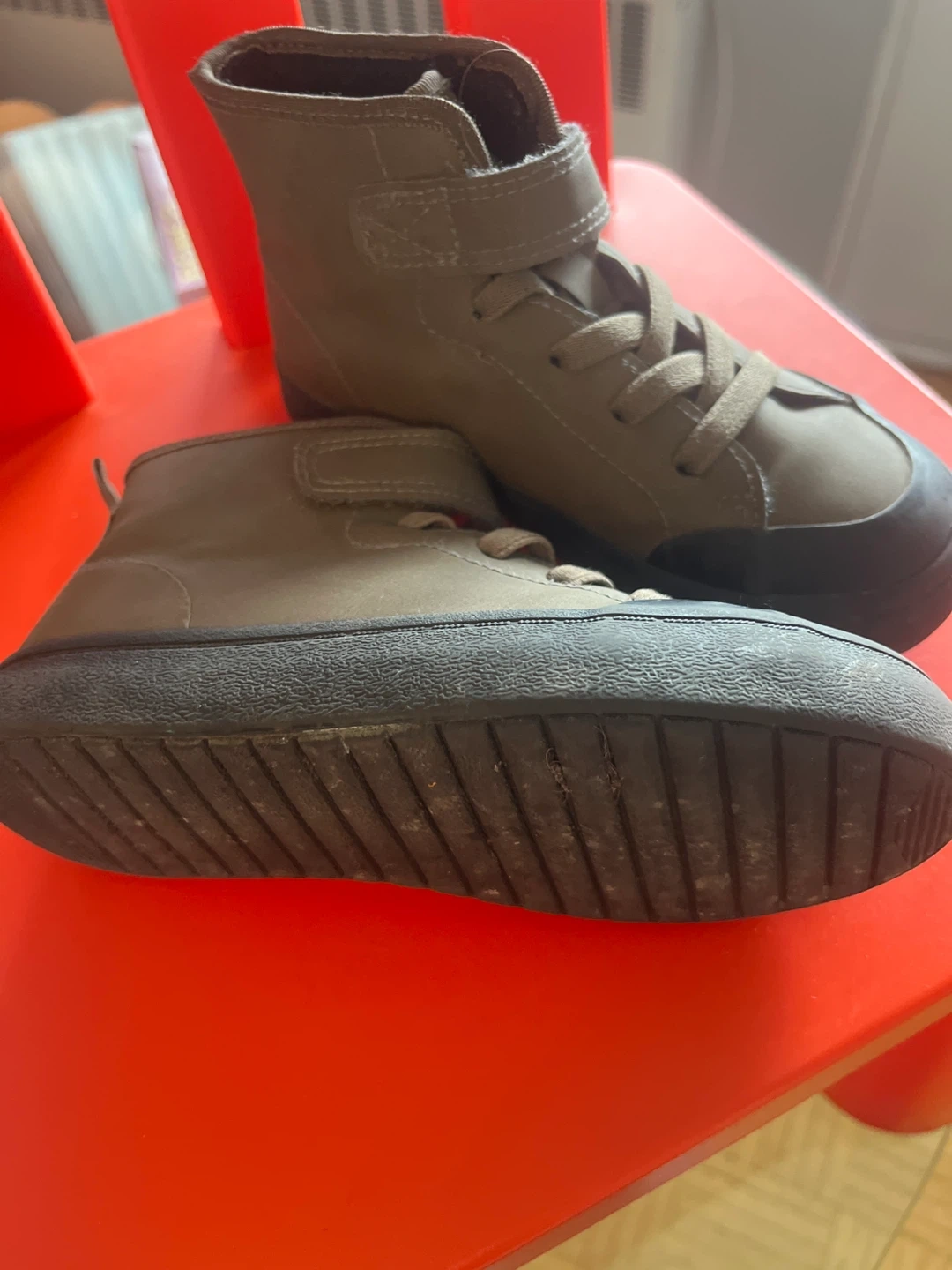 10These H&M olive green high-top boots are in great condition and ready for a new home! They feature both laces and a velcro strap for a secure fit. The size is US 11 (EUR 28). Perfect for everyday wear!
