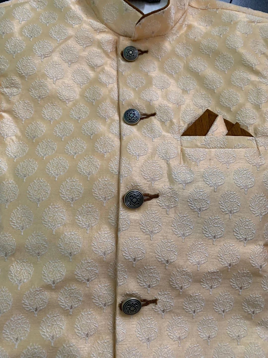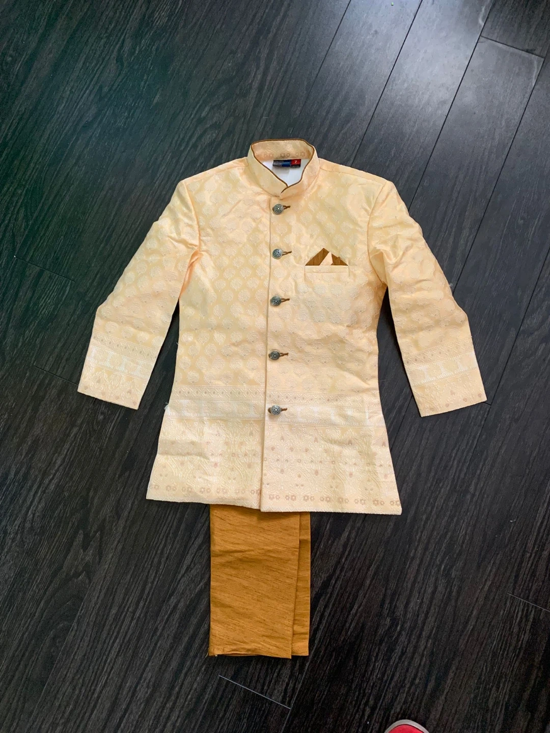 A lovely sherwani set for boys, size 7. The set includes the jacket and pants. It features a subtle tree pattern throughout and a decorative pocket square. Perfect for special occasions!