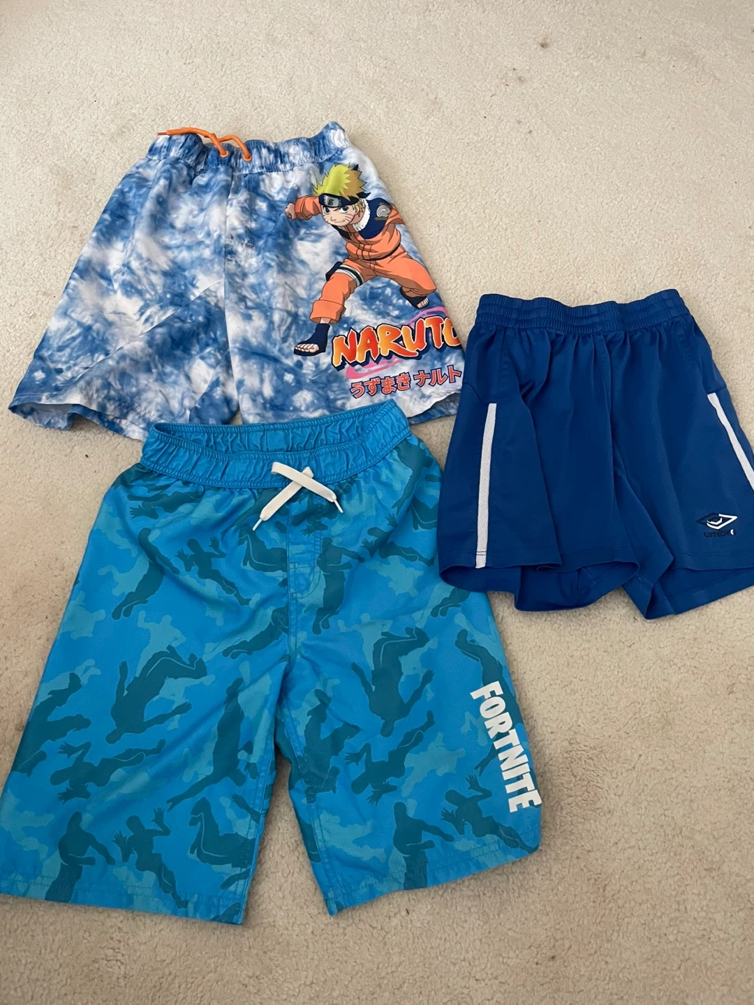 Selling a set of three boys' swim trunks! One is a blue Fortnite pair, another is a Naruto pair, and the third is a solid blue Umbro pair. The size is L/G (10-12).