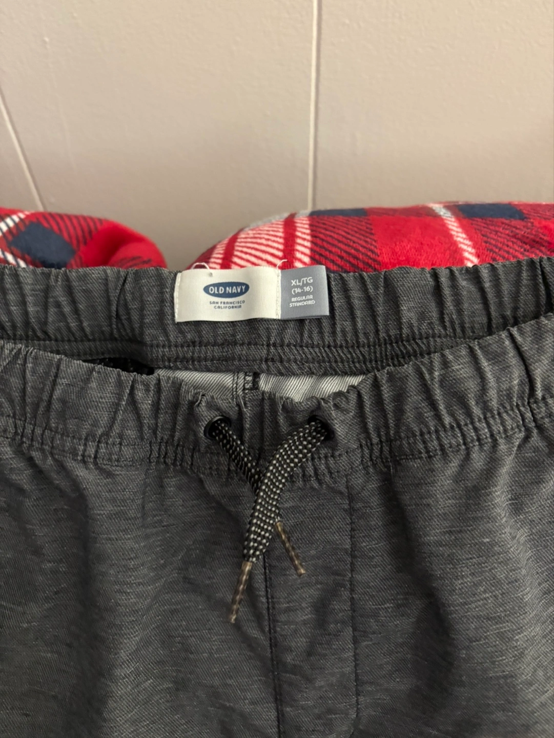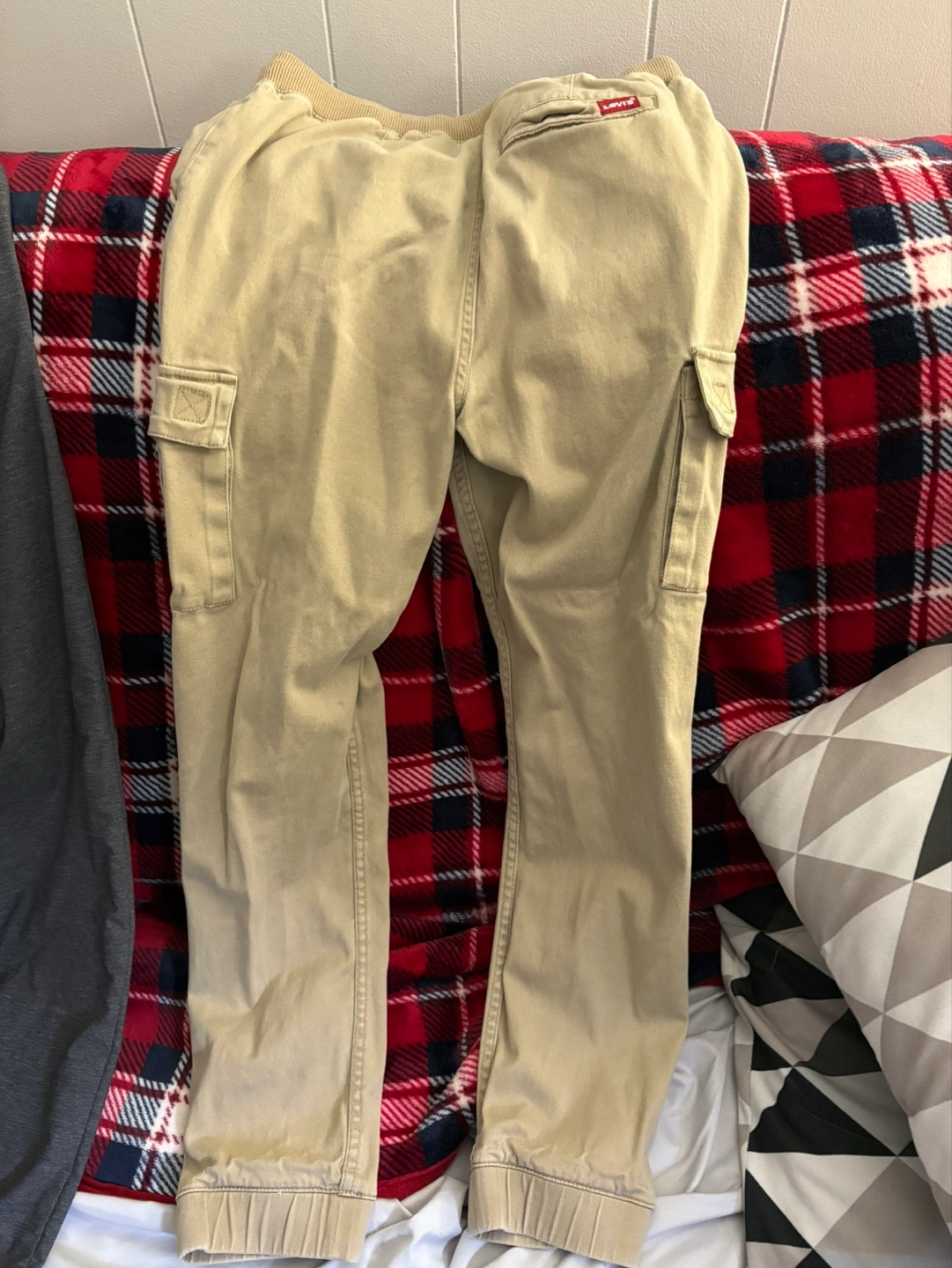 Two pairs of boys cargo joggers. One pair is grey Old Navy, the other is tan Levi's. Both are size XL. Elastic waistband and drawstring. Pockets. $10 for both