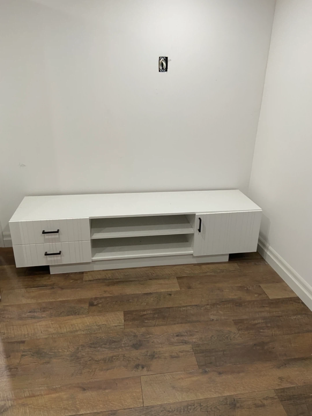 This is a white media console. It has two drawers on the left and a cabinet with a single door on the right. There are also two open shelves in the centre. It's a nice piece for organizing your entertainment space.