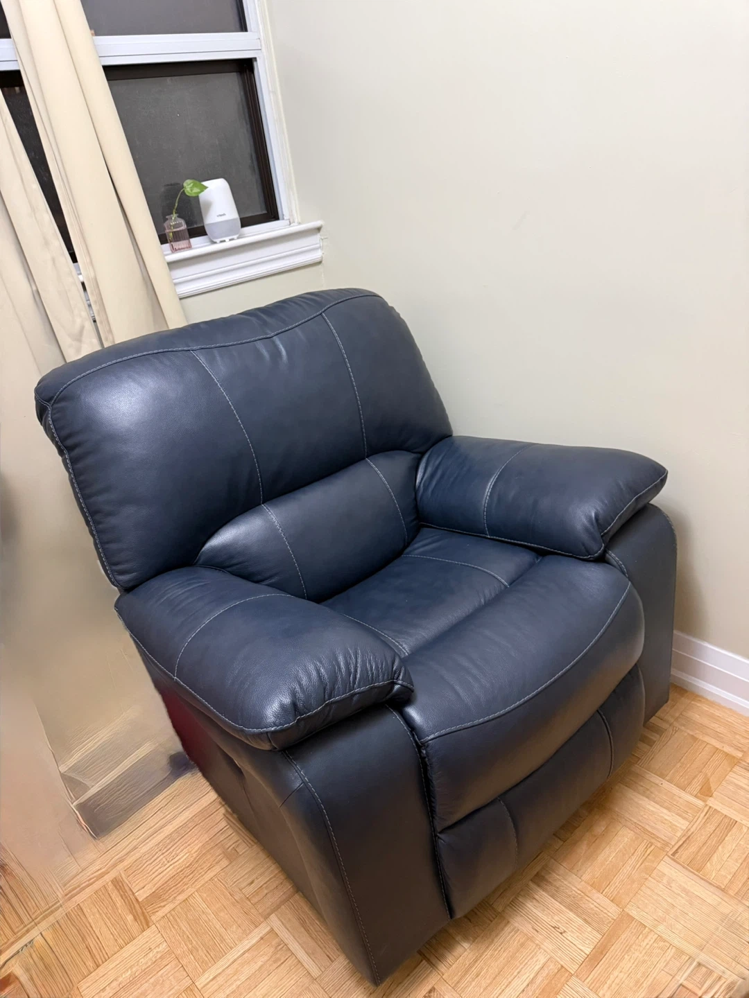 Comfortable navy blue electric rocker recliner chair with plush padding. It's made of faux leather and features a smooth reclining mechanism. This recliner would be great for relaxing in any living space. Its very easy to clean and maintain. It was bought new about 5 months ago. I’m only selling because I’m moving out of the province. Honestly, I love this recliner. 😭