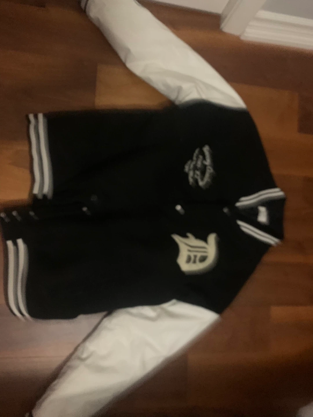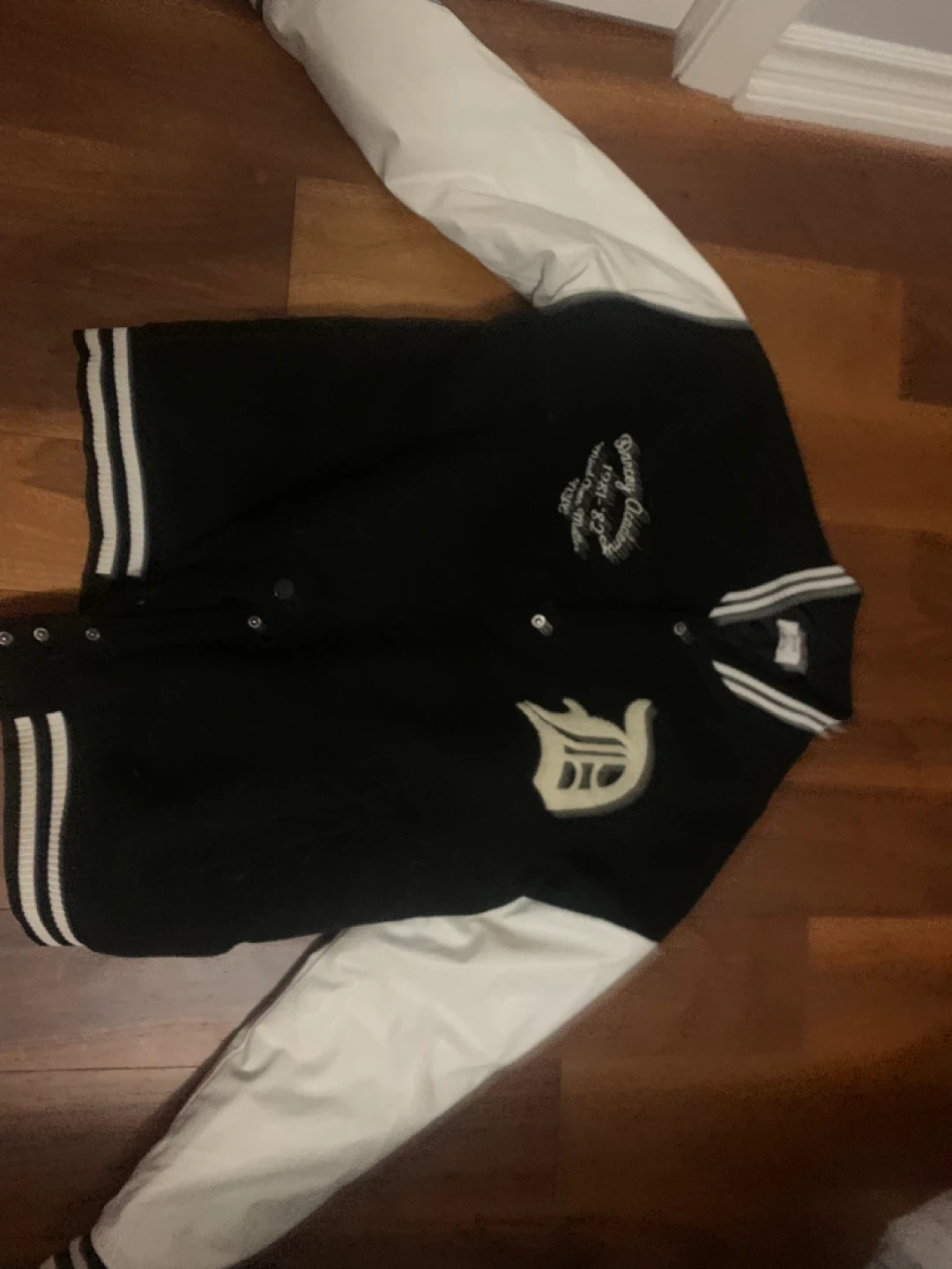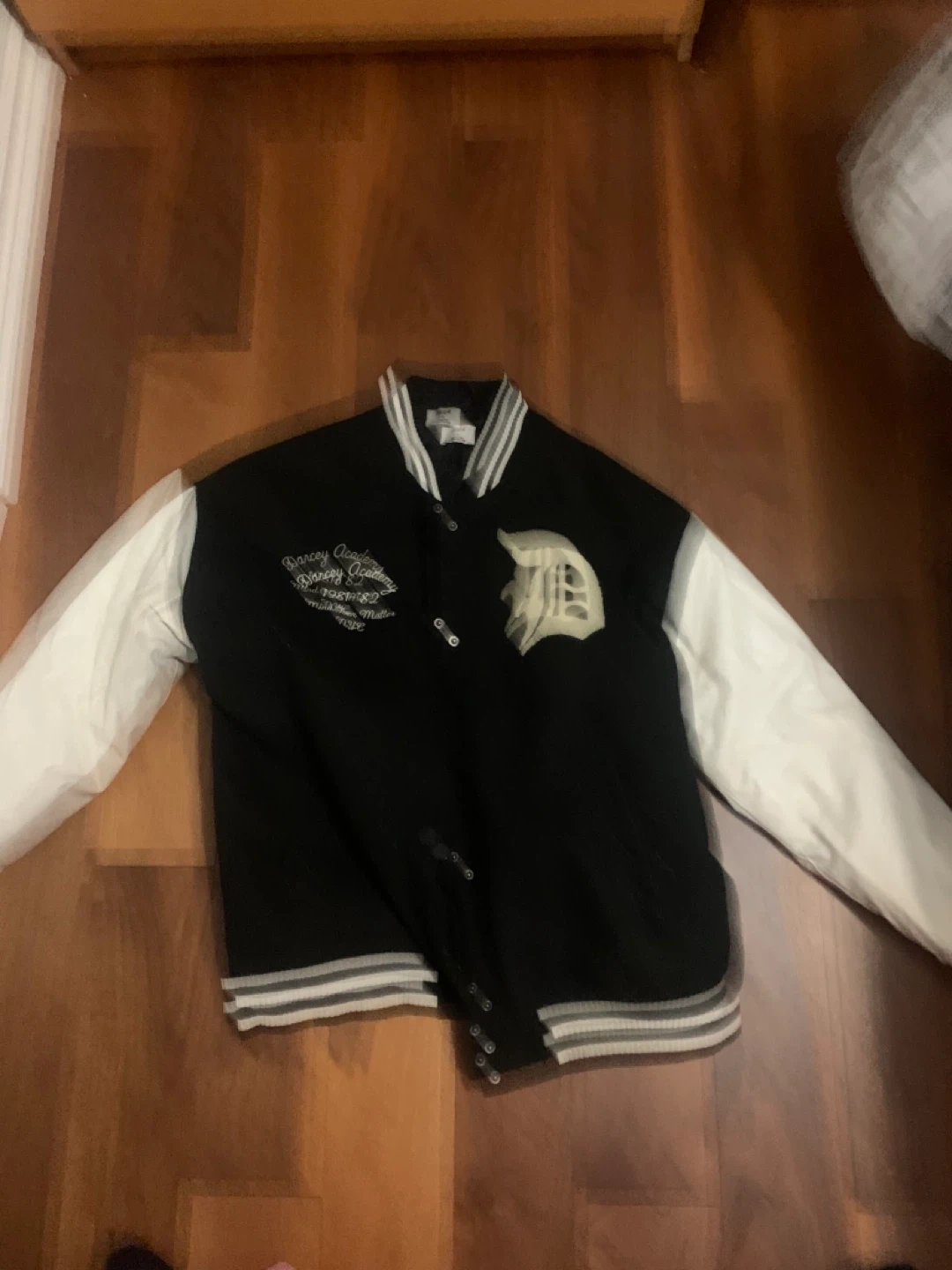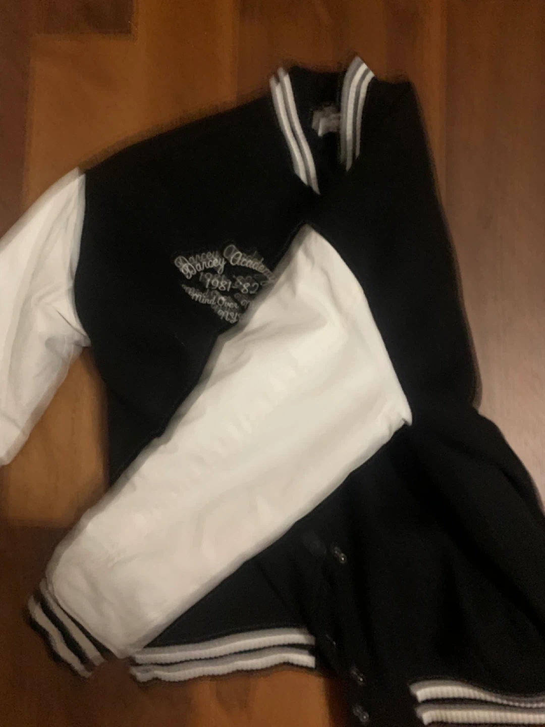 Black and white varsity jacket with embroidered details. Features a snap button closure and striped ribbing on the collar, cuffs, and hem. Looks like it's from 'Barry Academy' with dates '1937-1982'.