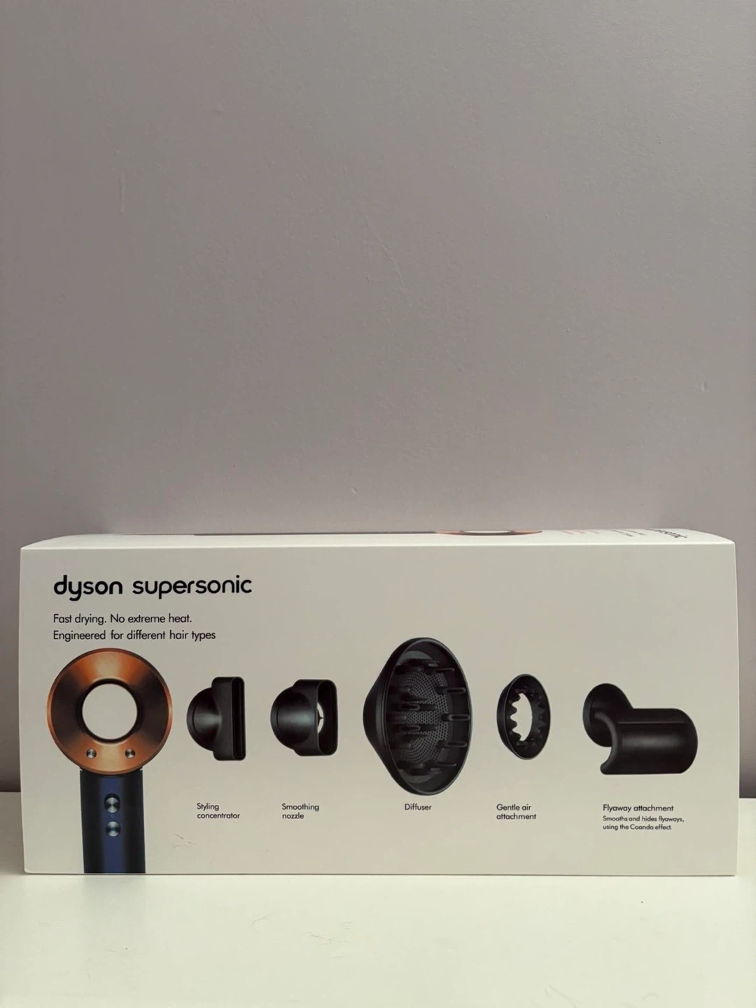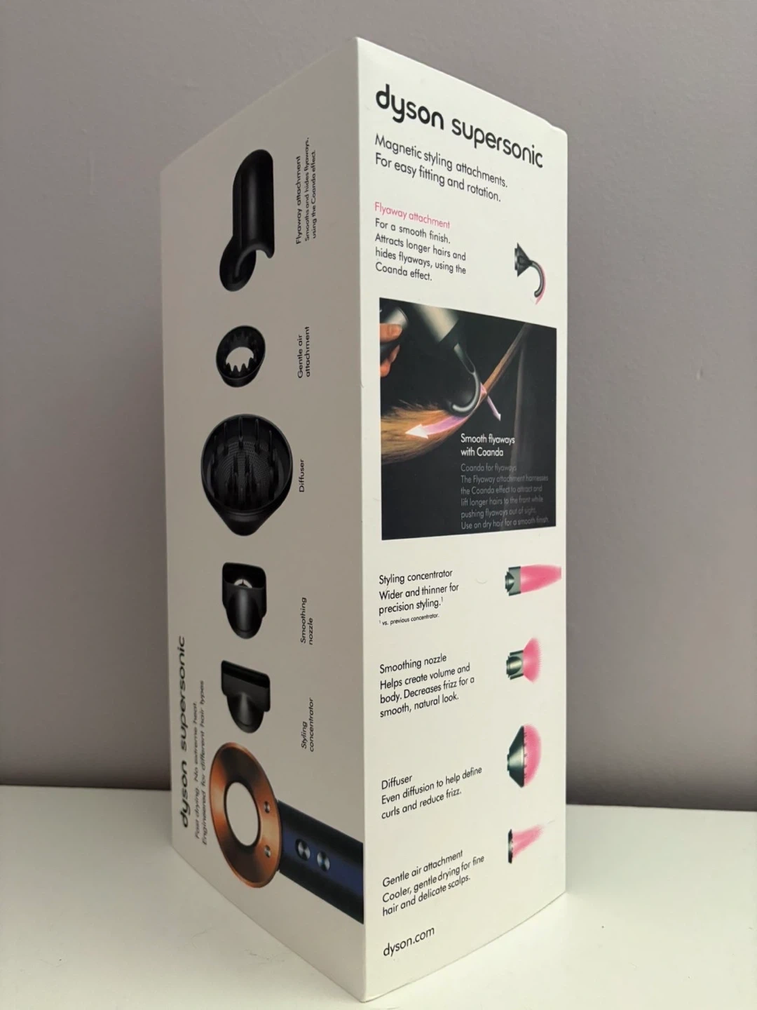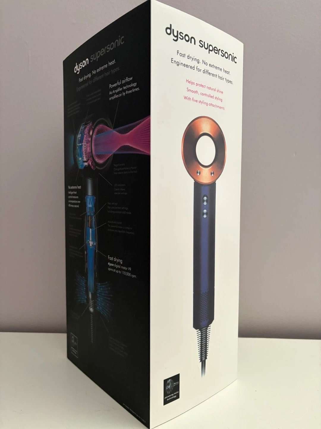 Dyson Supersonic hair dryer in dark blue and copper. Includes five magnetic styling attachments: Flyaway attachment, Styling concentrator, Smoothing nozzle, Diffuser, and Gentle air attachment. Fast drying and engineered for different hair types.