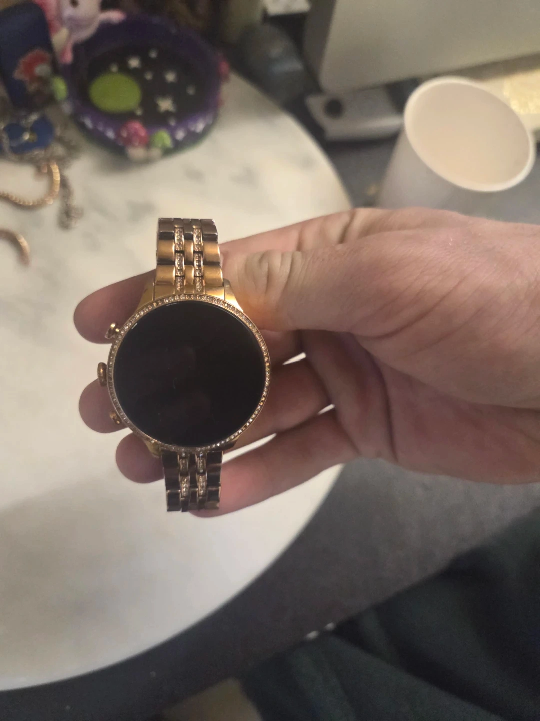 A rose gold Fossil smartwatch with a diamond-accented bezel. It features a digital display and a metal link band. This stylish watch is great for everyday wear and keeping track of your notifications.