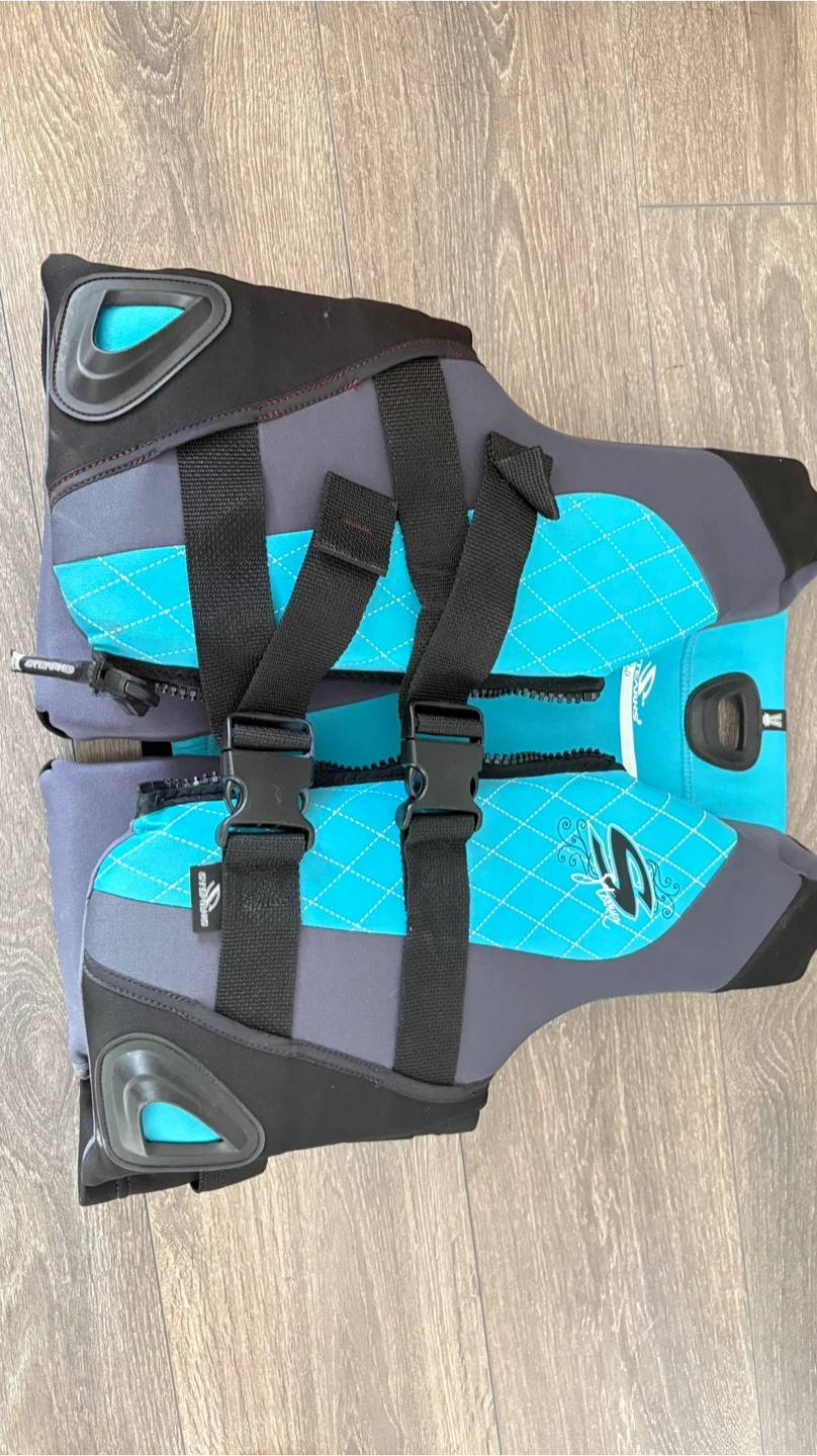 Stearns adult life vest in a vibrant blue and grey. It features adjustable straps and buckles for a secure fit. Zipper closure on the front. Designed for water sports and boating safety.