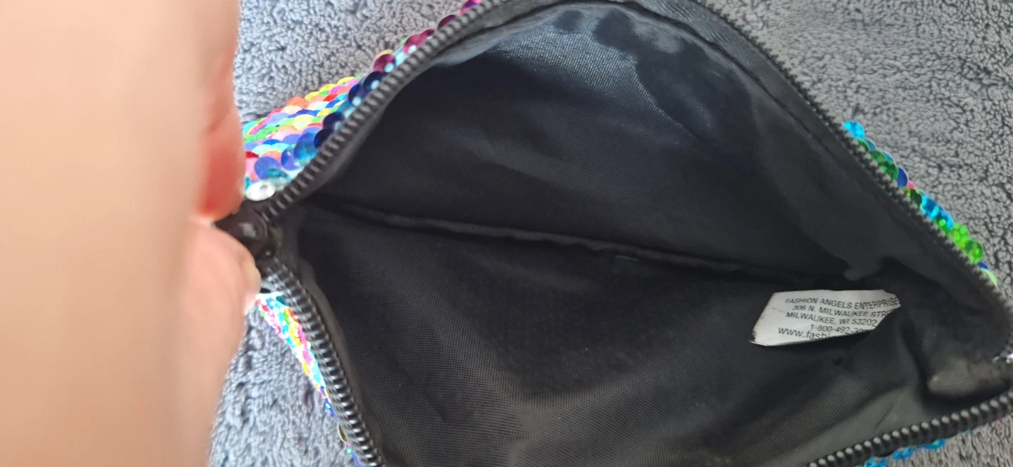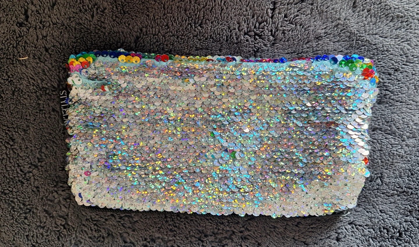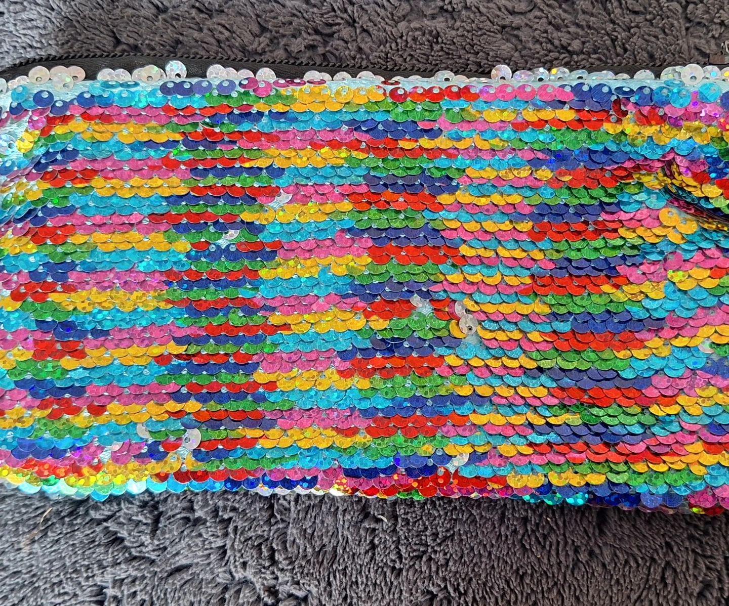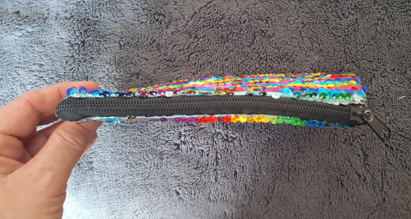 This fun pencil case is covered in colourful reversible sequins. It's got a black zipper closure and a black fabric interior. Great for storing pens, pencils, makeup, or other small items!