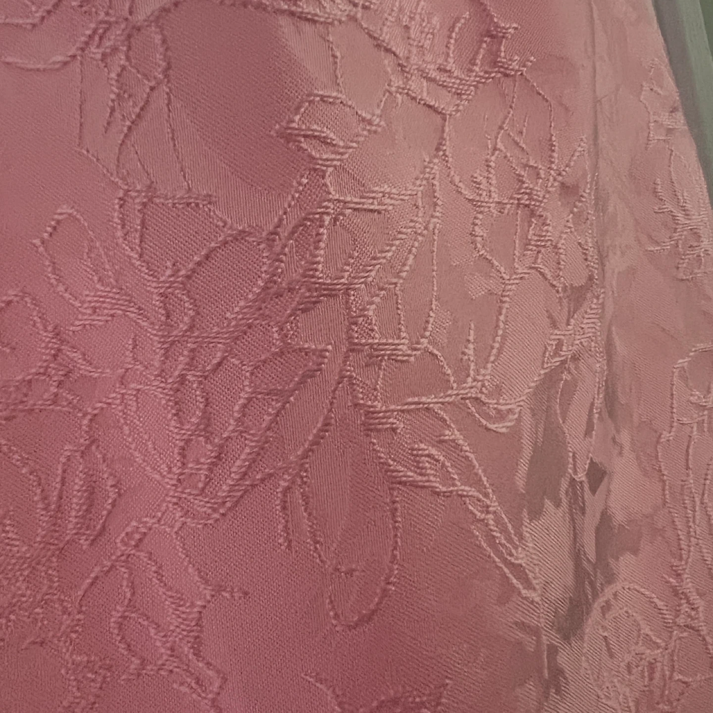 This is a beautiful pink gown with a textured brocade fabric. It features a flattering mermaid silhouette and a striking bow that can be worn on back or not . It's perfect for formal events!