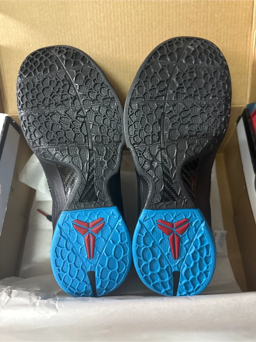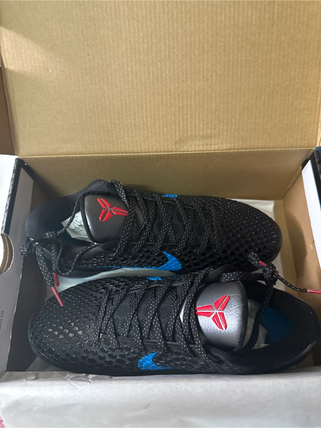 These are Nike Kobe 11 Elite basketball shoes in a Brave Blue colorway. They feature a knit upper and a carbon fiber shank for support. The shoes come with their original box. They're designed for performance on the court!