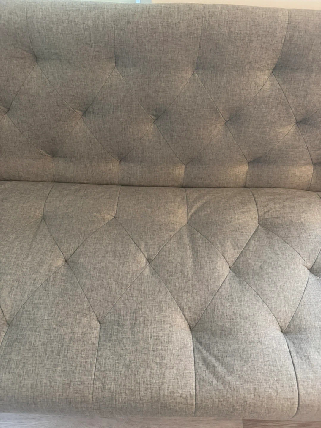 Tufted sofa upholstered in a light grey fabric. It features two built-in cup holders on the arms and a convenient USB charging station. Perfect for a living room or den!