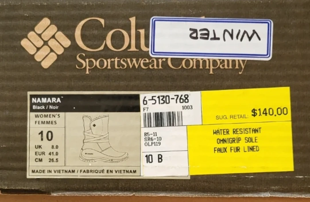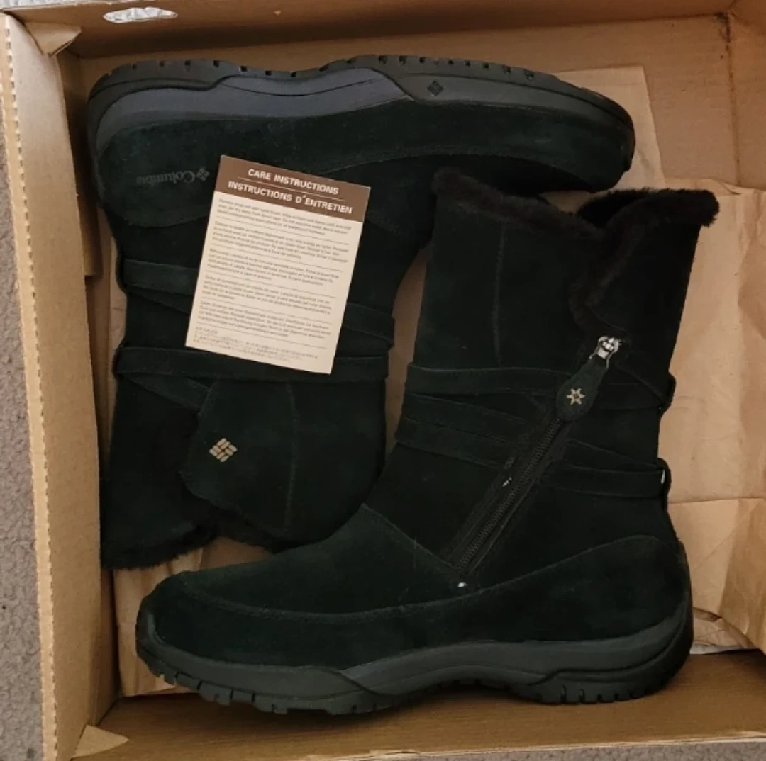 Unworn Columbia Sportswear Company winter boots in black with box. These waterproof boots feature faux fur lining and an omnigrip sole. Includes original box and care instructions. Size 10 (US Women's). They were just a little too big for me as I'm a size 9.5. Original price $140 plus tax.
