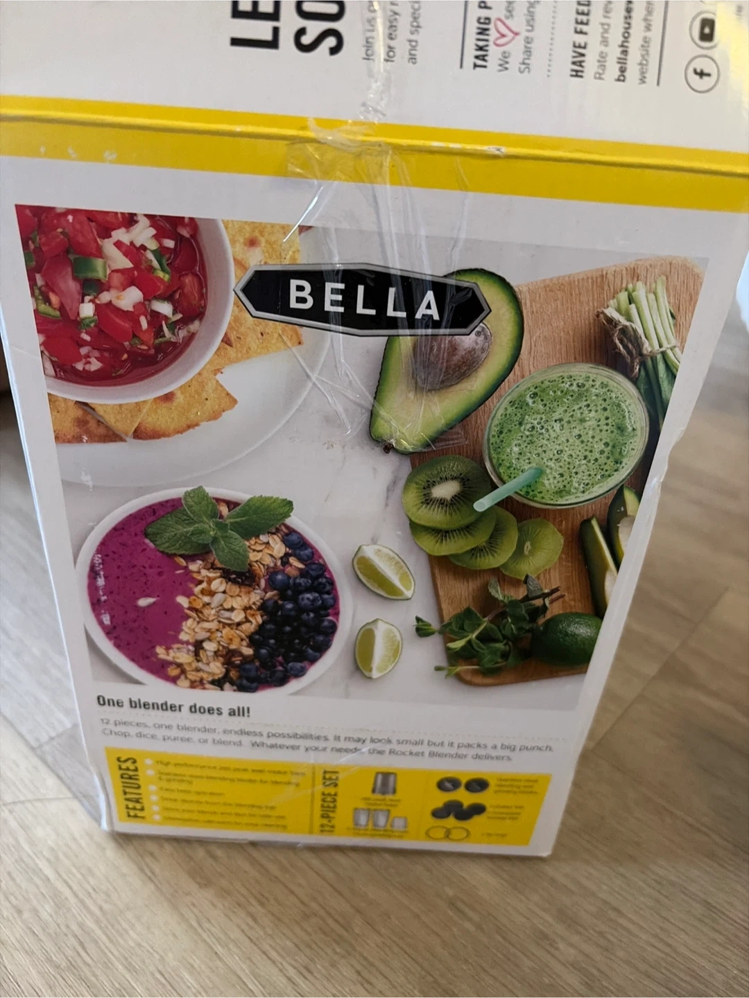 This is a BELLA Rocket Blender 12-piece set. It includes cups and lids that are dishwasher safe. The blender is designed for mixing, chopping, and grinding.