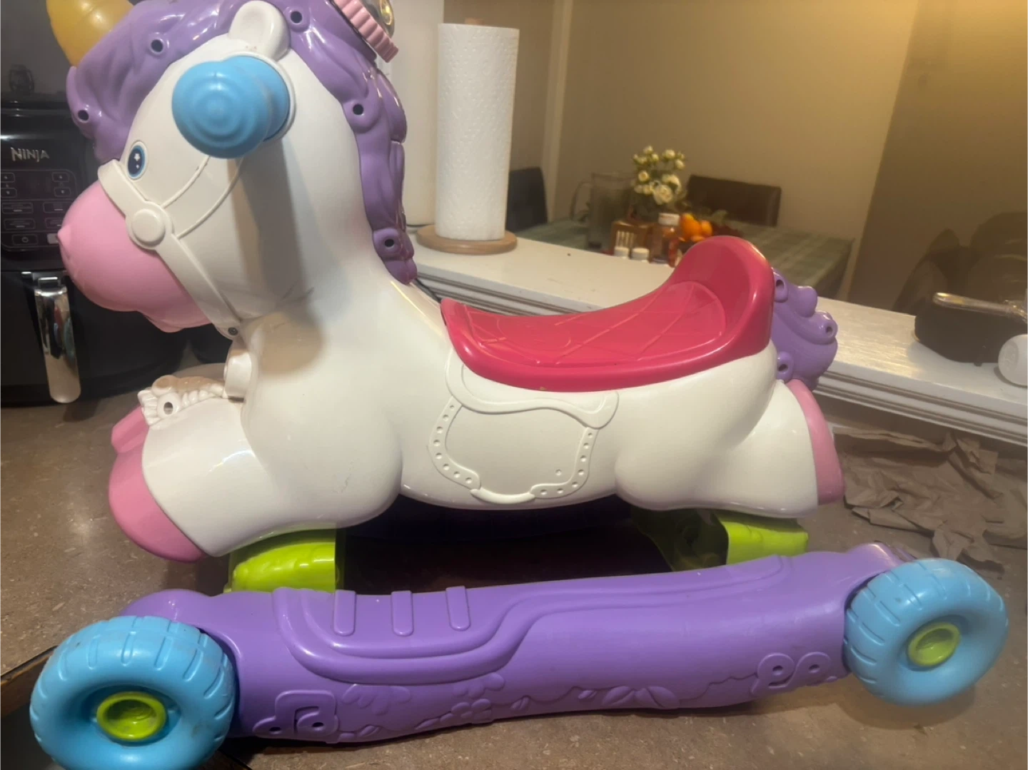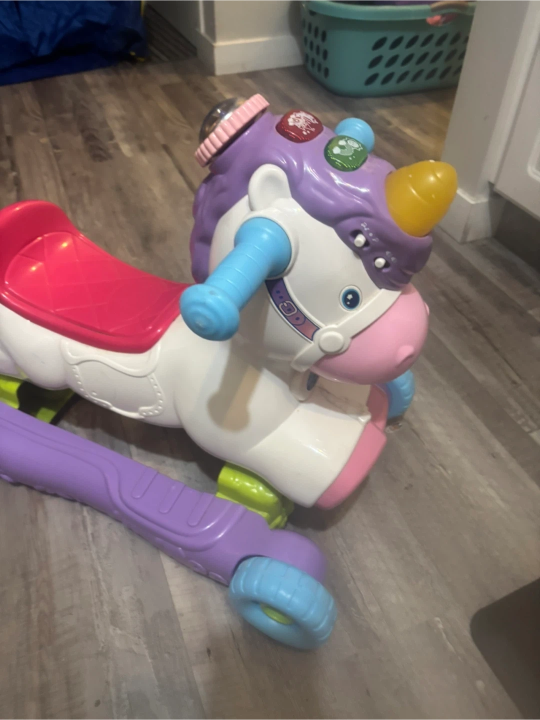 This VTech ride-on unicorn walker is perfect for little ones learning to walk! It plays music and sounds, featuring lights and interactive buttons on its head. It converts from a floor toy to a ride-on, with a sturdy seat and handlebars for support. A fun way for toddlers to explore and develop motor skills!