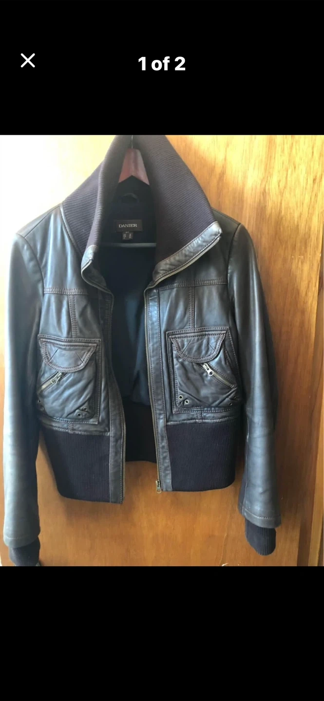 Danier leather bomber jacket with ribbed collar, cuffs, and hem. Features zippered pockets and a dark brown finish. It's a stylish piece for cooler weather.
