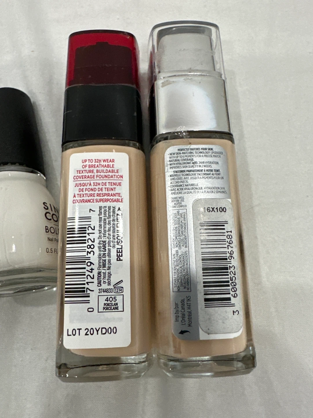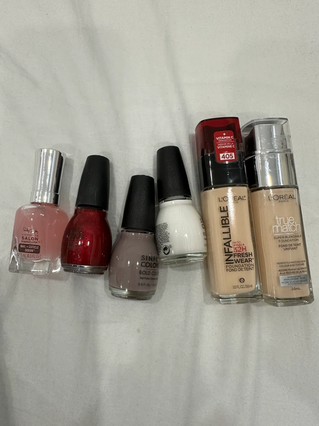 Bundle includes L'Oréal Infallible Fresh Wear foundation in shade 405 and True Match foundation. Also features Sinful Colors and Sally Hansen nail polish colours. Foundation bottles are 30ml each. Nail polish bottles are 0.5 fl oz / 15ml.