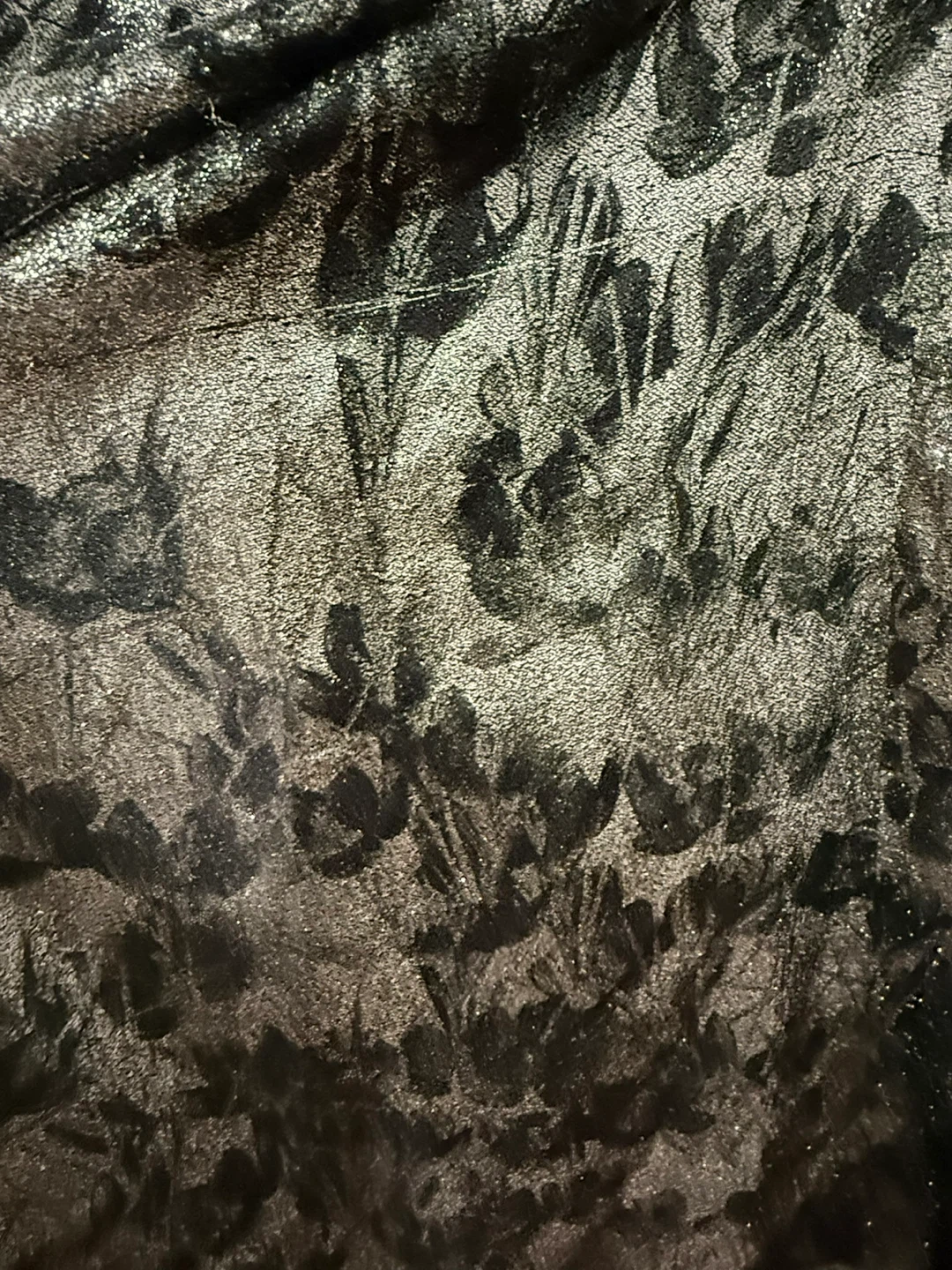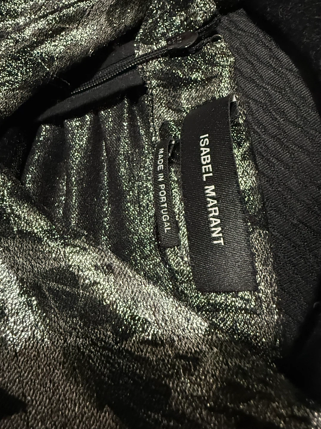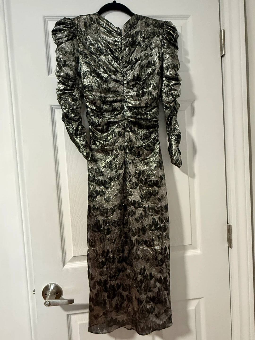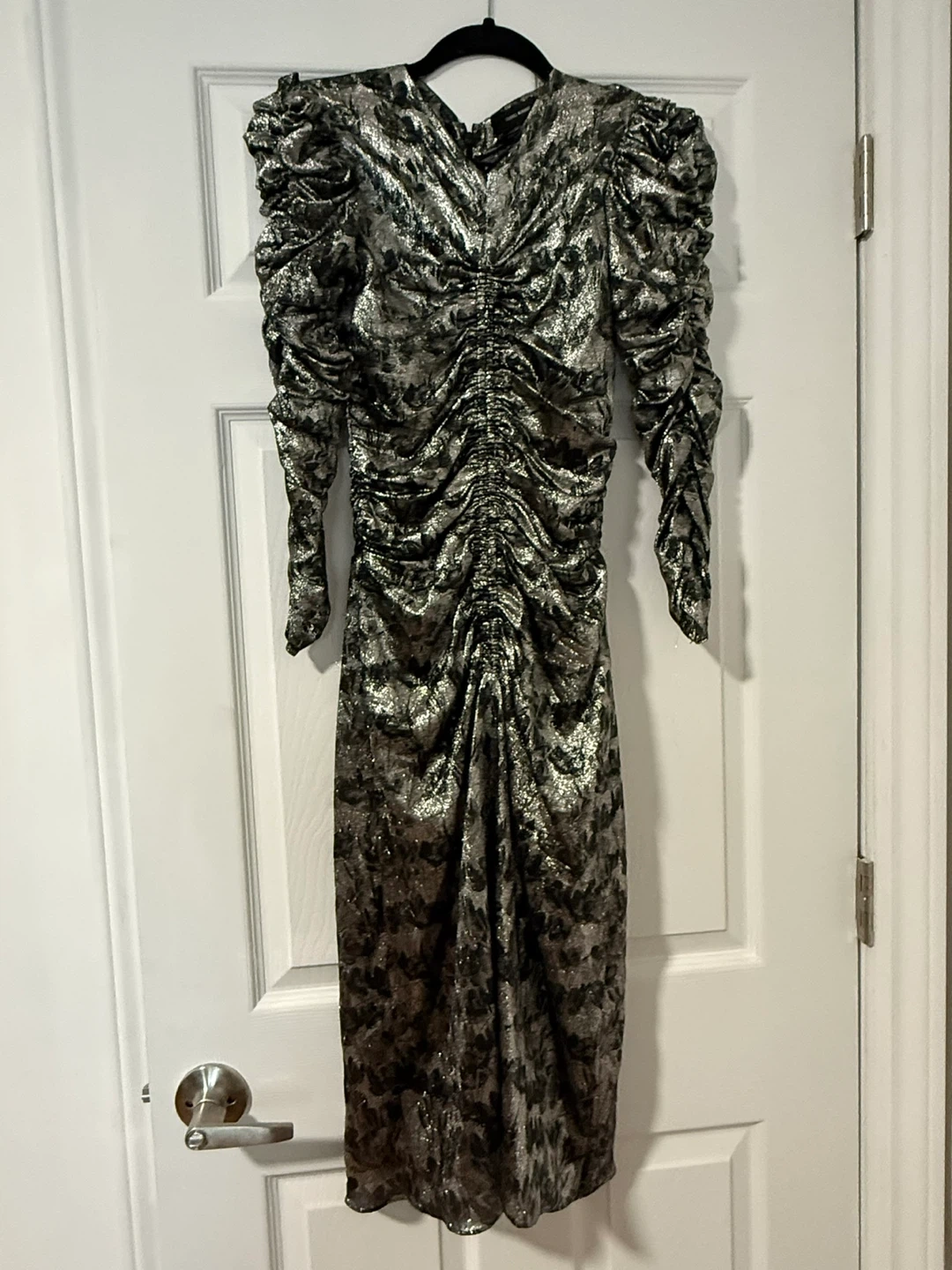 This Isabel Marant dress features a striking metallic pattern and ruched detailing on the bodice and sleeves. Size 34.