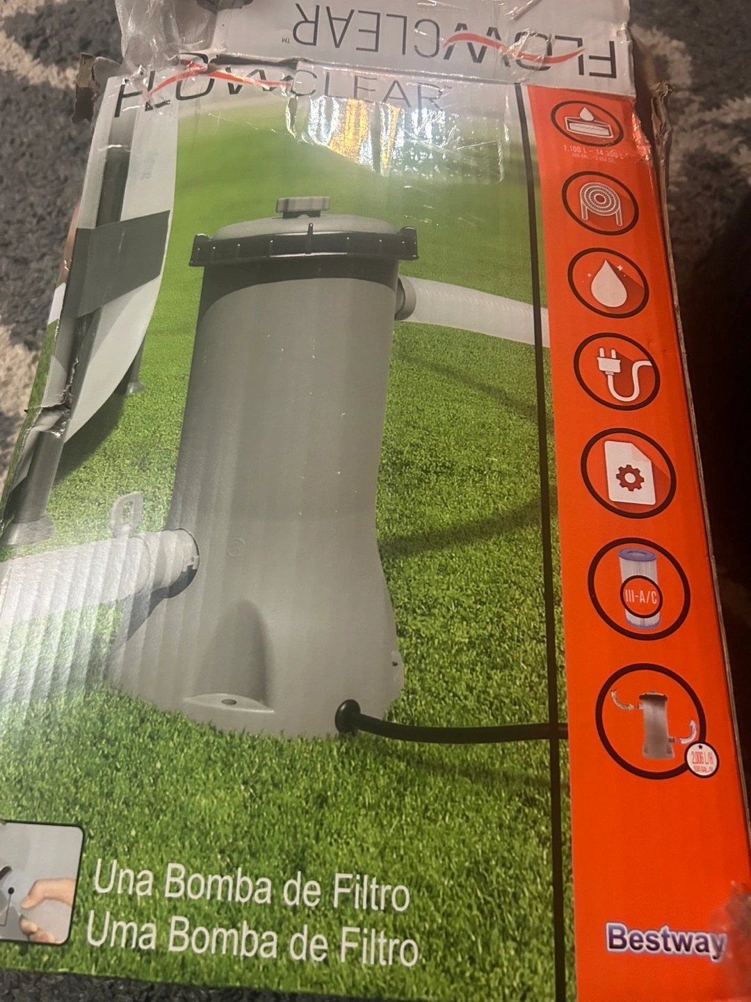 Selling a brand new Flowclear filter pump, still in its original packaging! It's designed for pools ranging from 1,100 to 14,300 L (300 to 3,800 gallons). This filter pump provides a water flow rate of 2,006 L/h (530 gal/h) and an integrated pool system flow rate of 1,817 L/h (480 gal/h). It uses one filter cartridge and is easy to install and maintain
