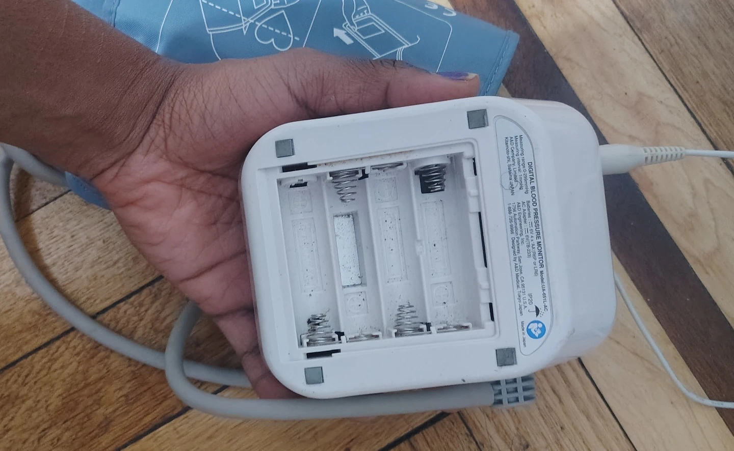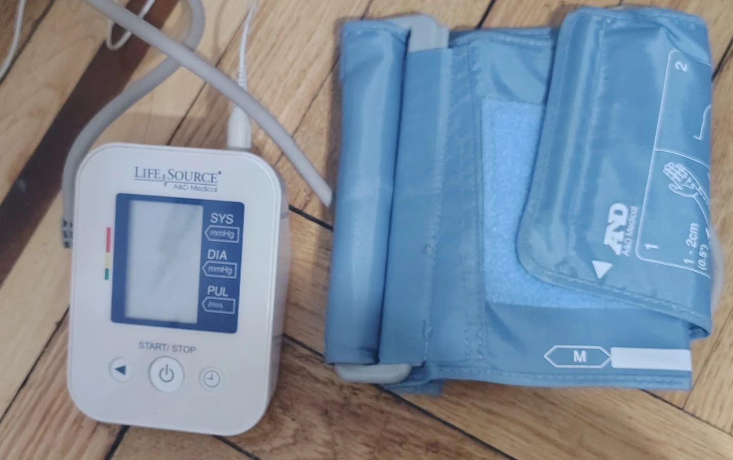 This is a Life Source digital blood pressure monitor. It uses 4 AA batteries. The cuff is size M. Missing cover piece for battery compartment. It also can be plugged into the wall