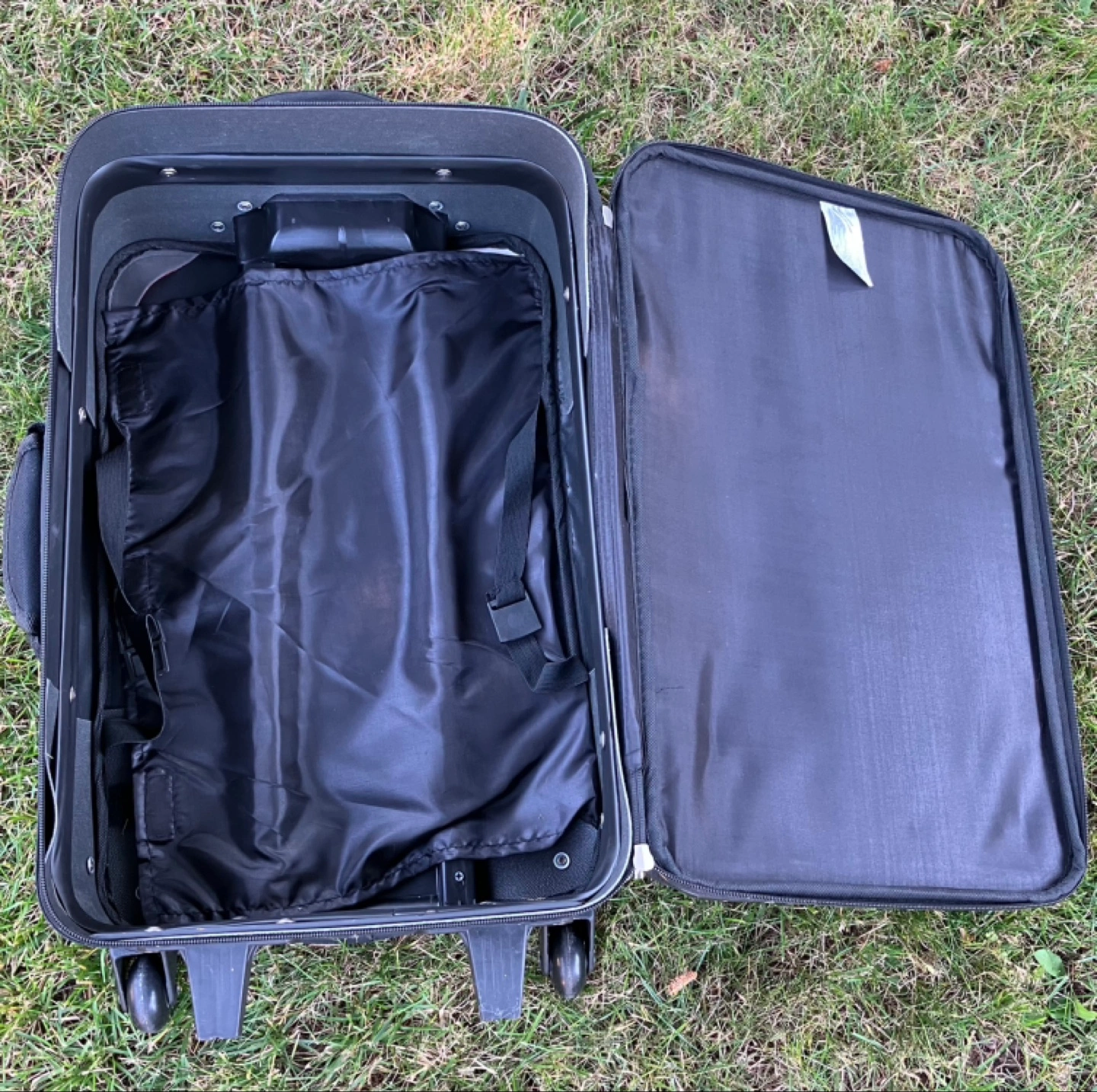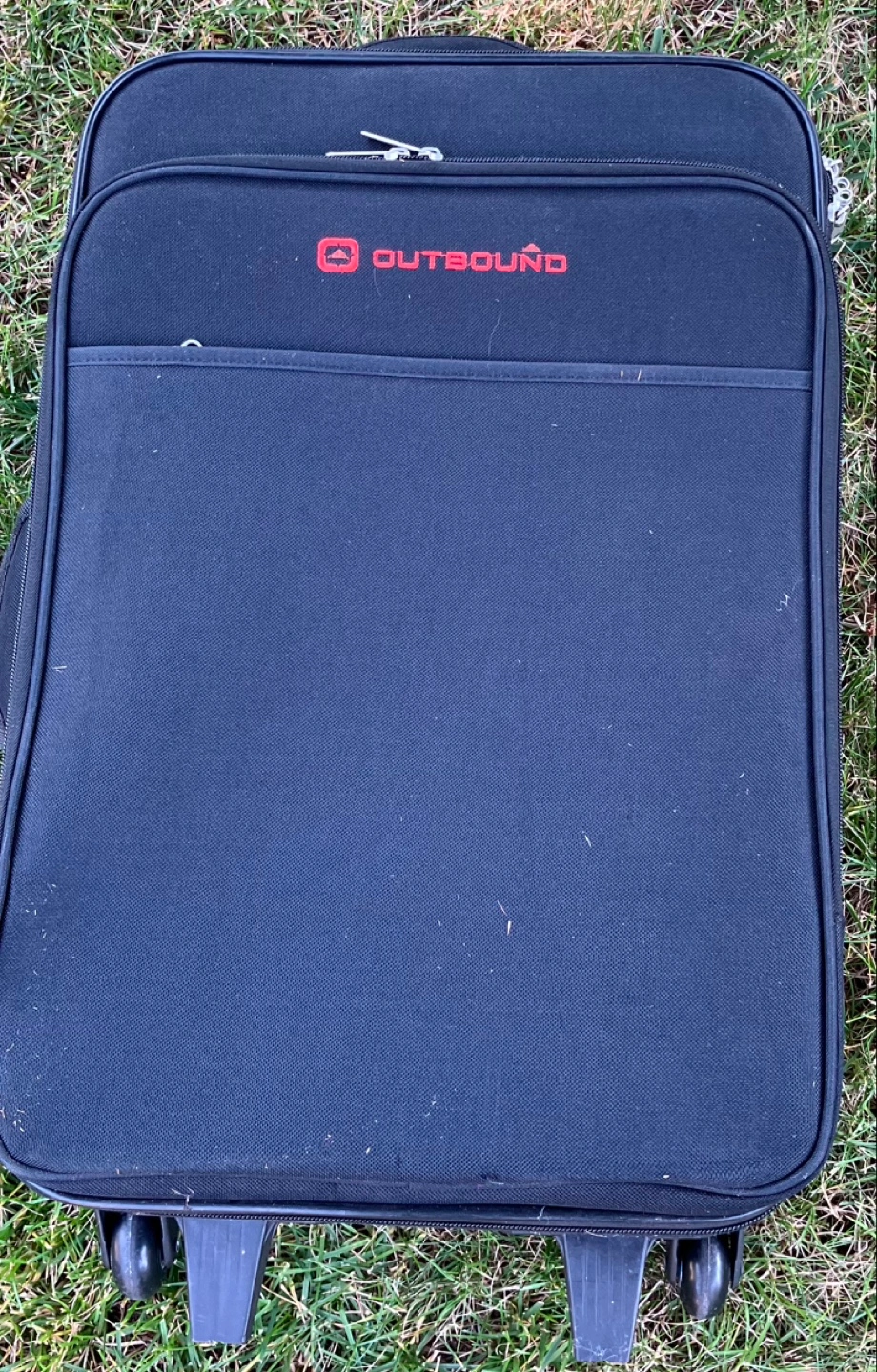 - Black Outbound carry-on suitcase with wheels and a handle