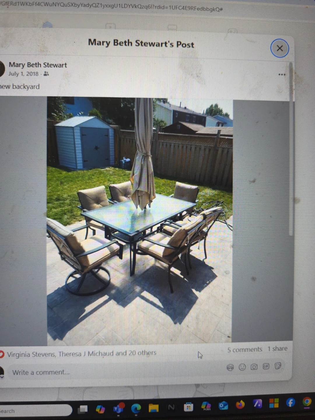 Glass top patio dining table with six upholstered chairs and a large umbrella. The set is ideal for outdoor entertaining. It's perfect for enjoying meals on the patio.