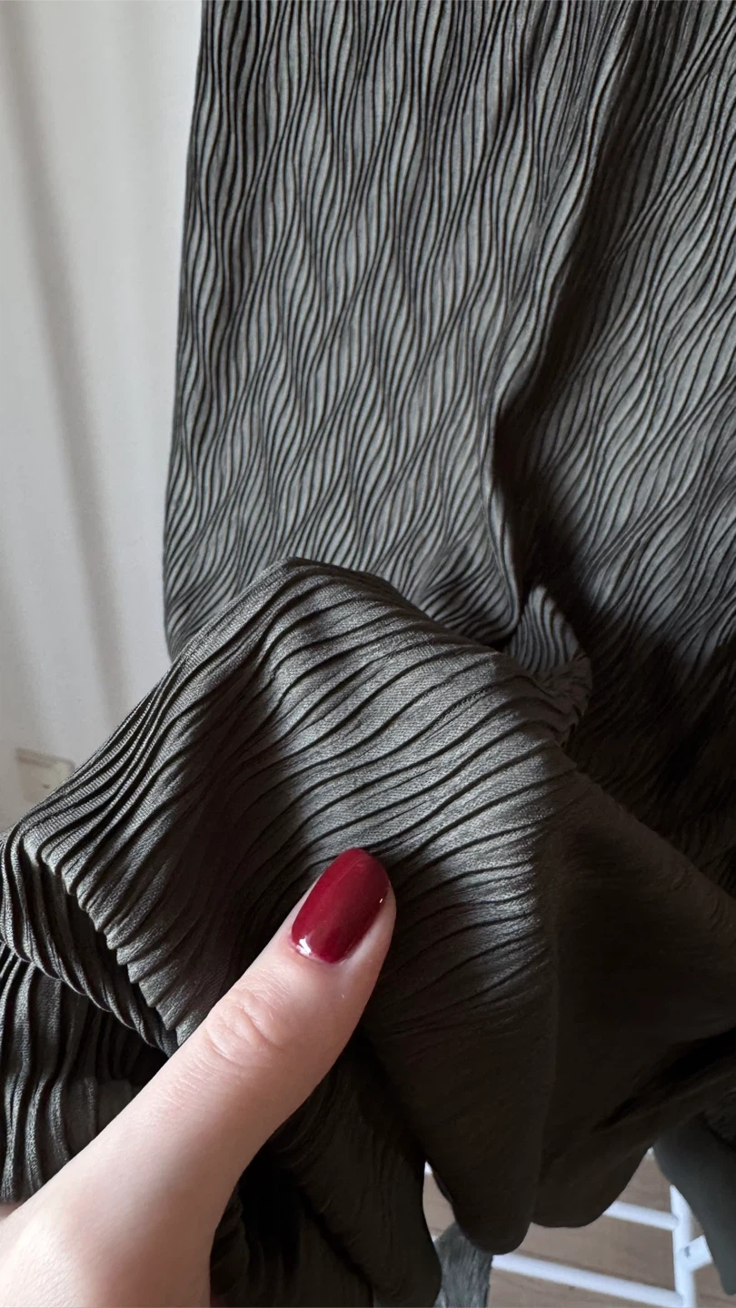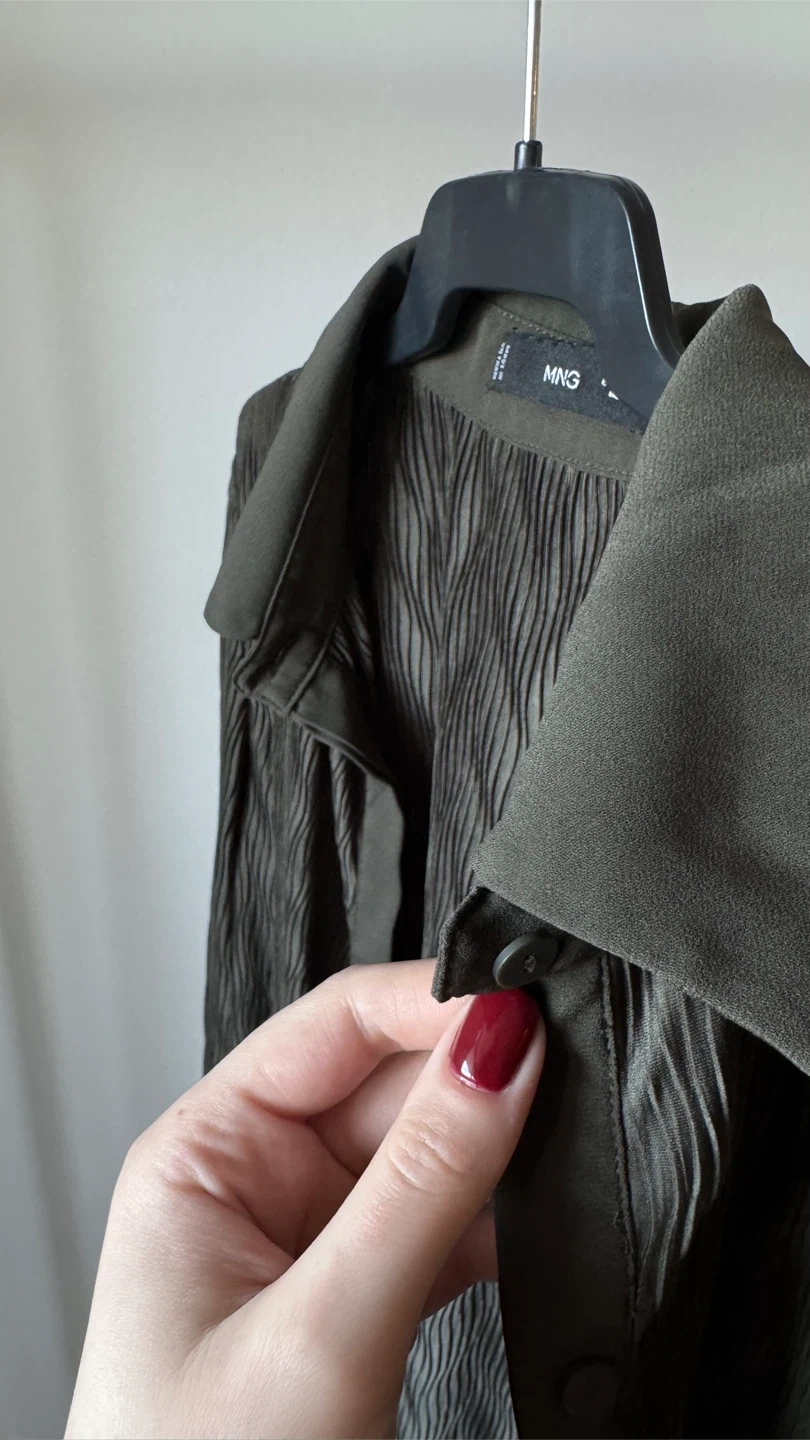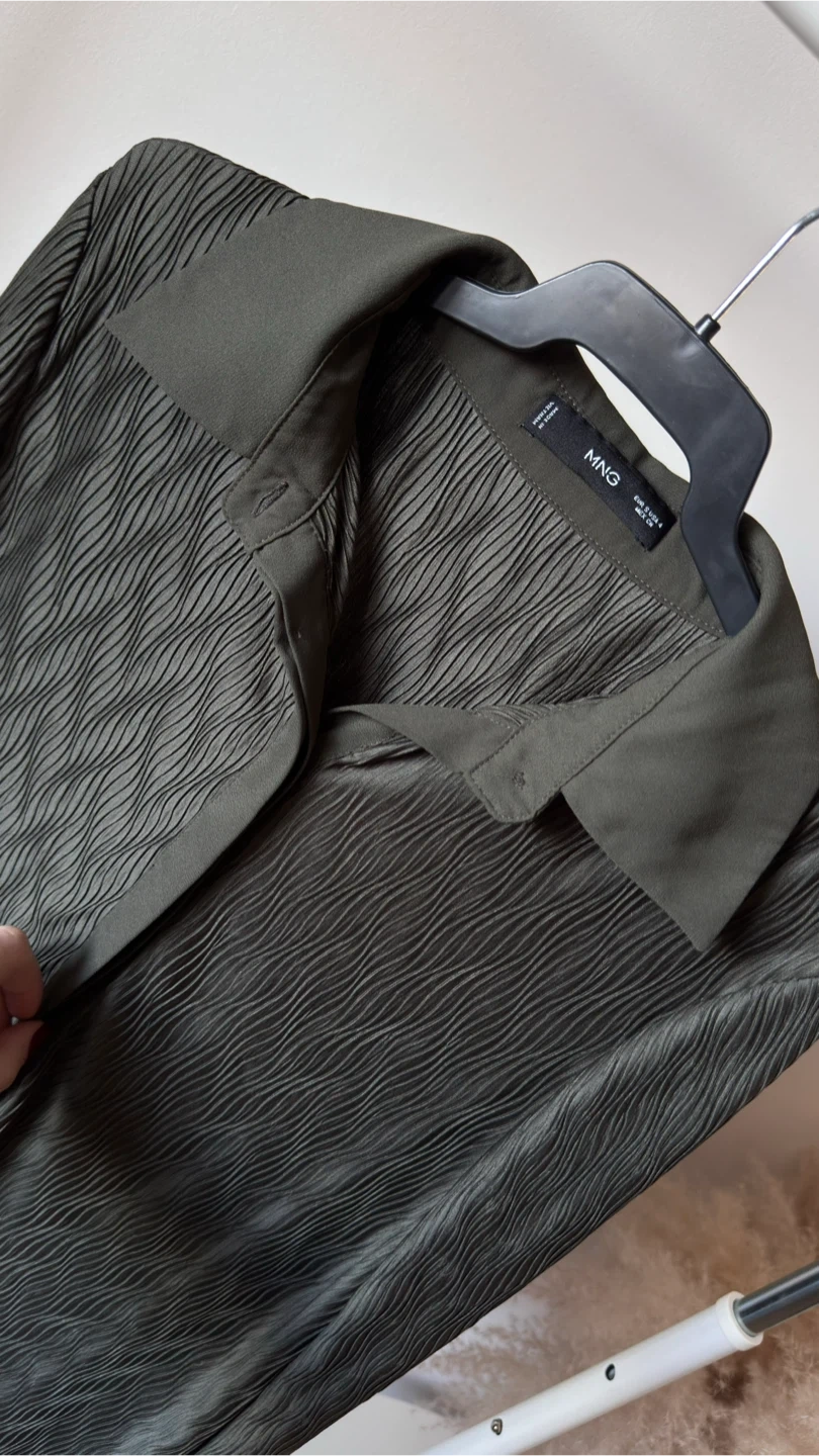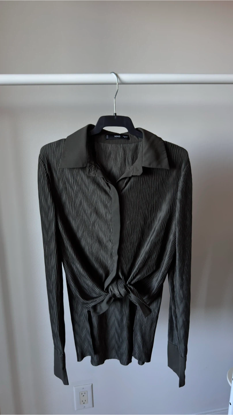 MNG dark green long-sleeve shirt with a unique textured fabric and a knotted front detail. It features a classic collar and button-up closure. Made of lightweight material.