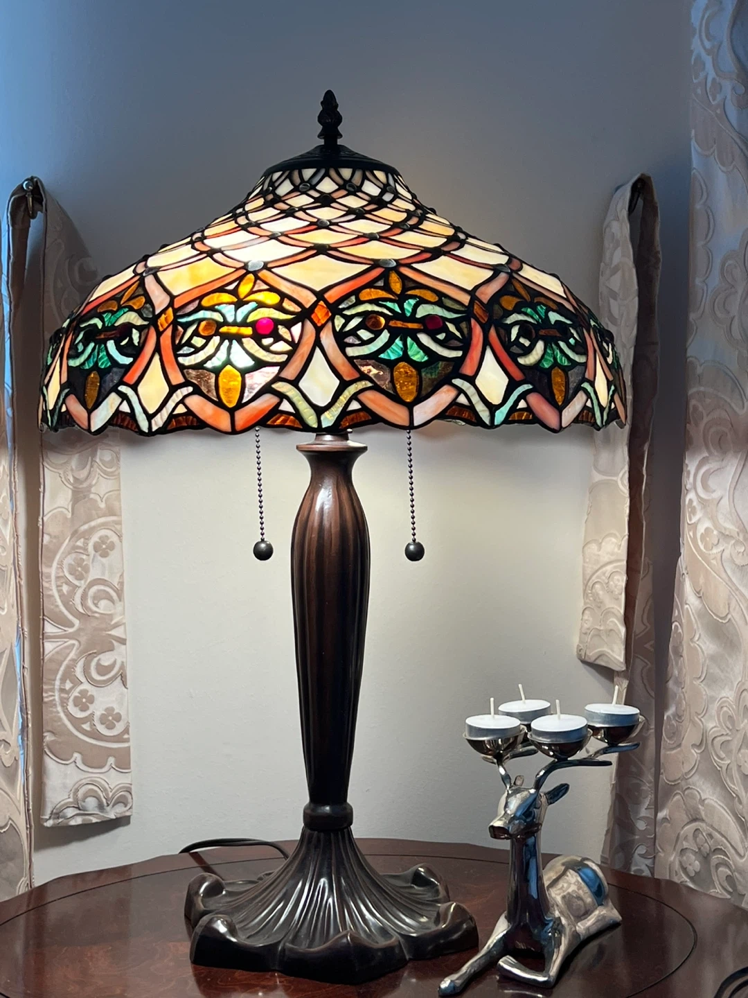 Beautiful and elegant vintage Tiffany-style table lamp, in perfect condition with no cracks, no chips, and no damage at all. The stained glass shade features a stunning floral pattern with warm amber, green, and red tones that create a cozy and classic ambiance when lit.