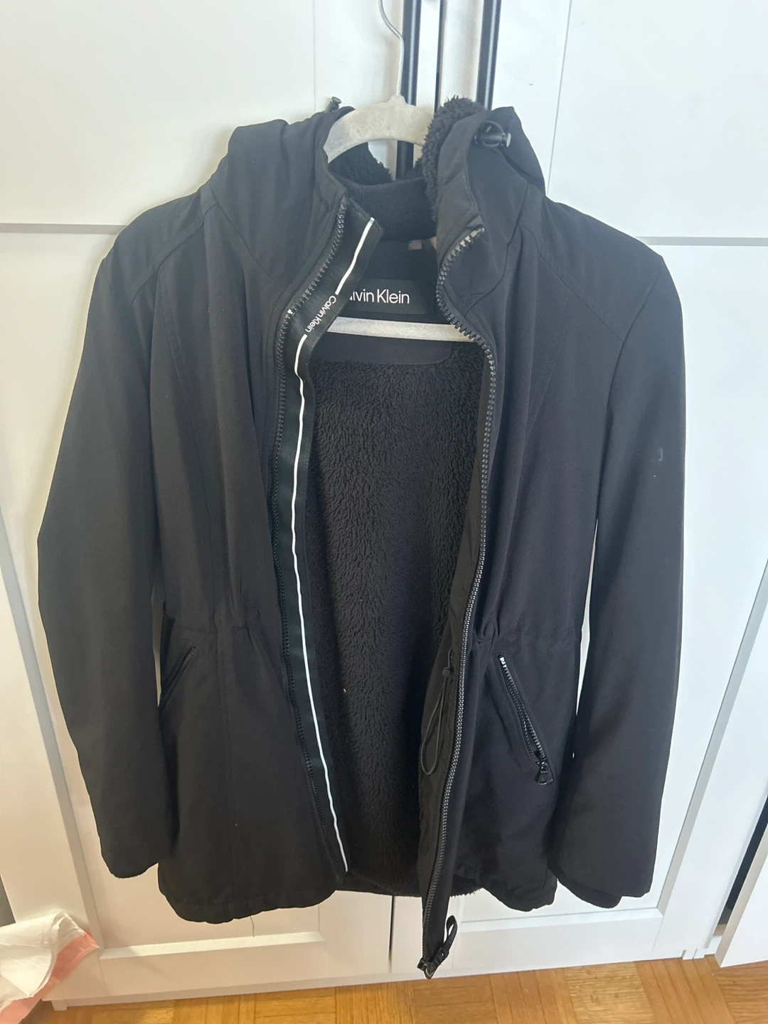 This Calvin Klein parka is black and features a cozy fleece lining for warmth. It has a drawstring waist for a customizable fit. It's a great jacket for chilly weather!