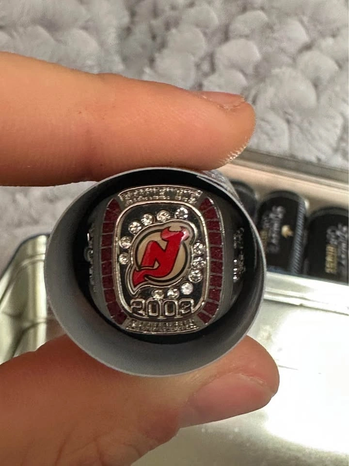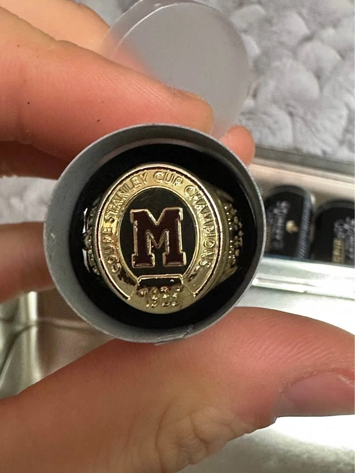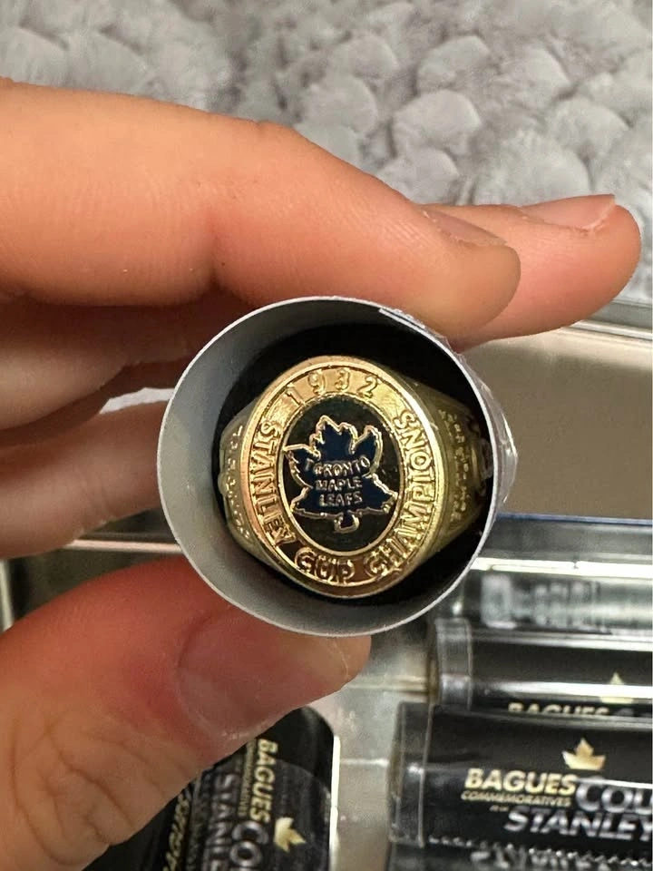 Set of 9 NHL Stanley Cup replica rings. Great for collectors or display. Includes teams like Canadiens, Rangers, Maple Leafs, Bruins, Devils, Avalanche, Islanders & more. Good condition, comes with case. Not real gold – commemorative replicas.