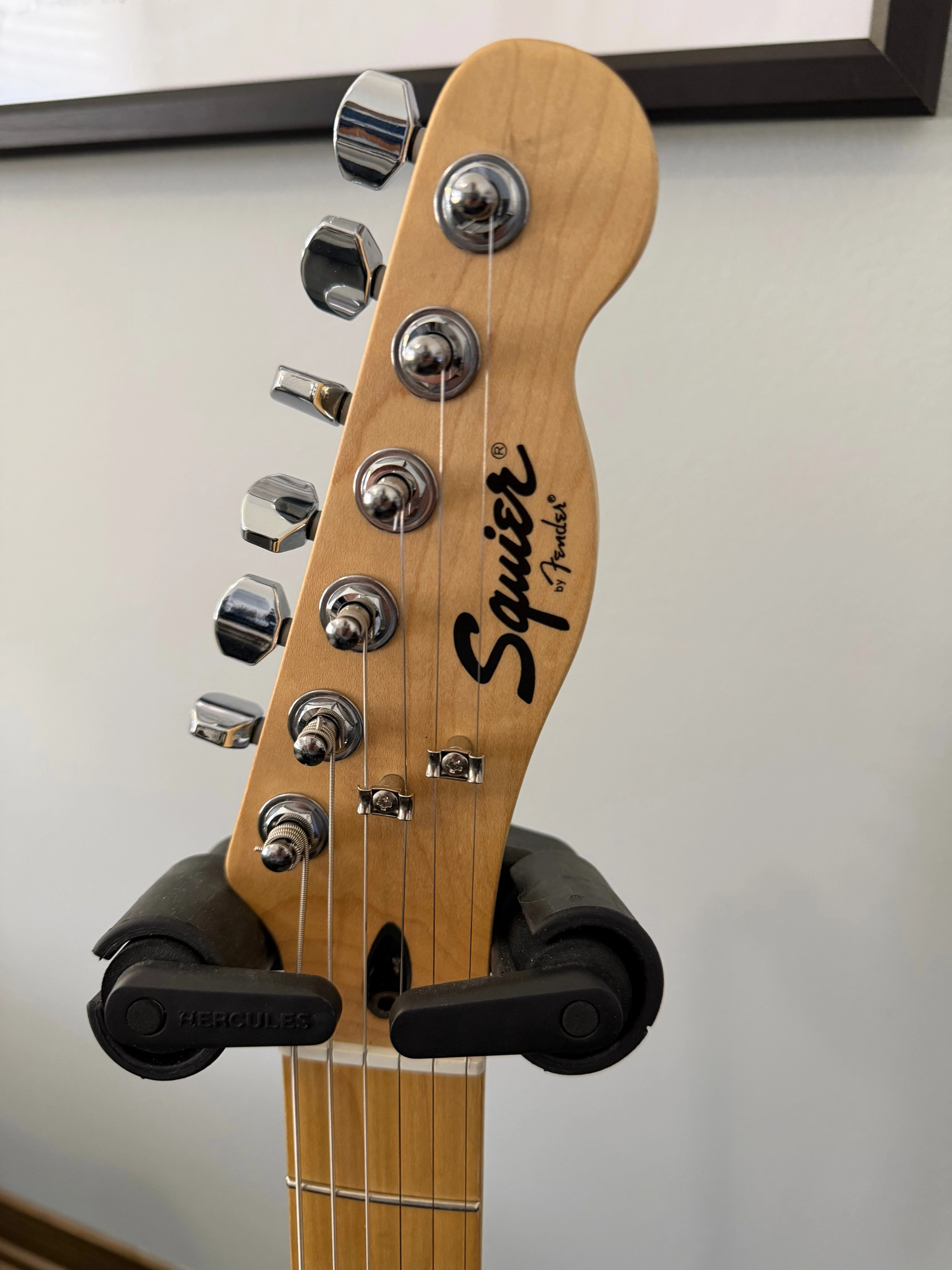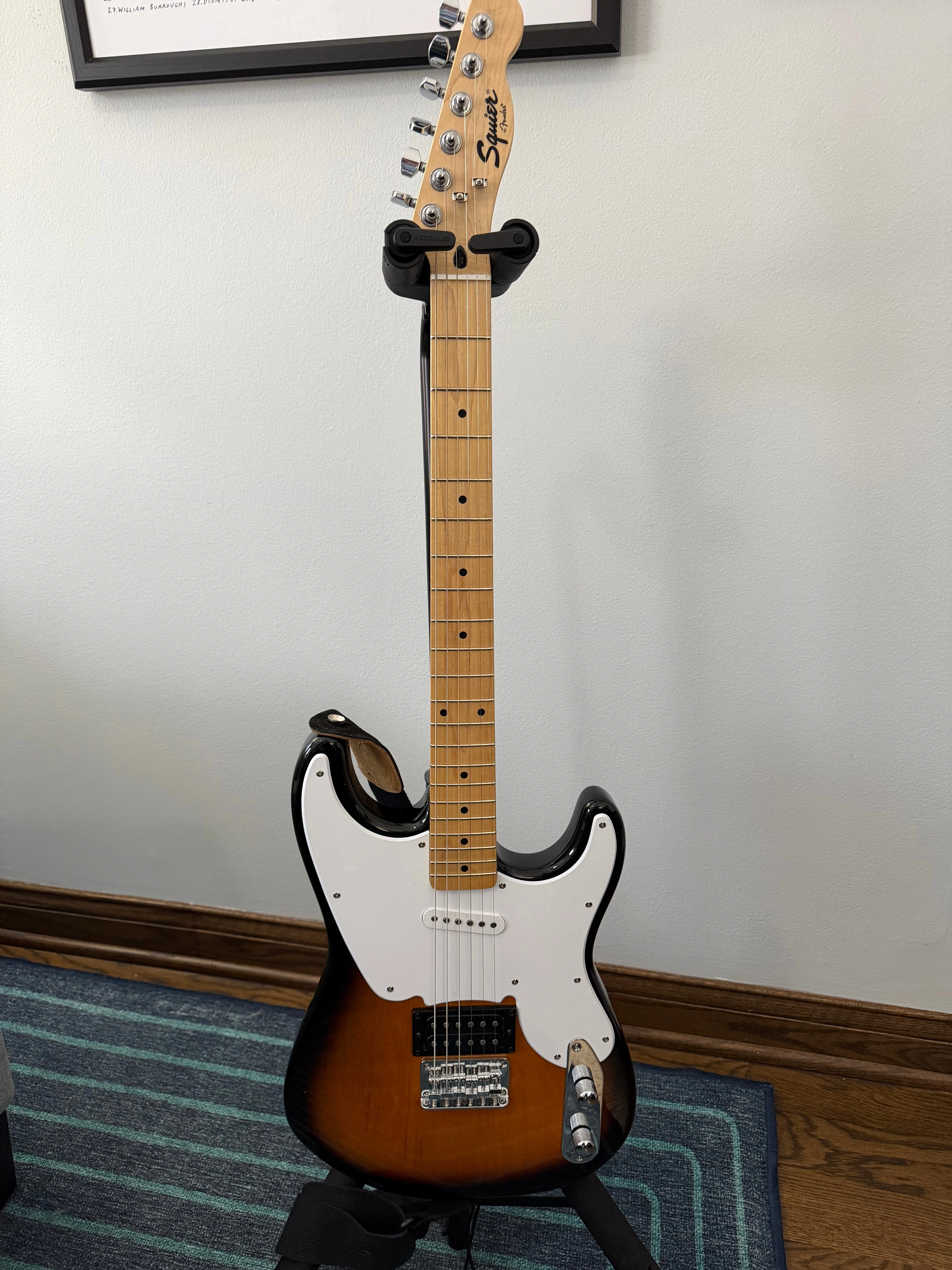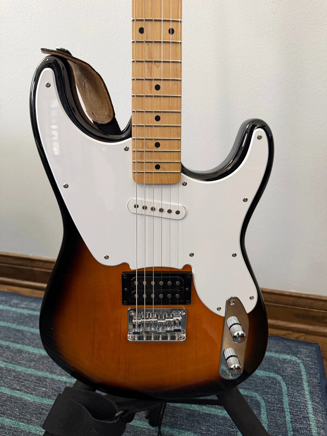 2005 made Squier `51 model. This is a unique guitar model which combines a telecaster neck, strat body, and a P-Bass style pickguard. The body is thinner, and combined with a slim neck makes playability easy.