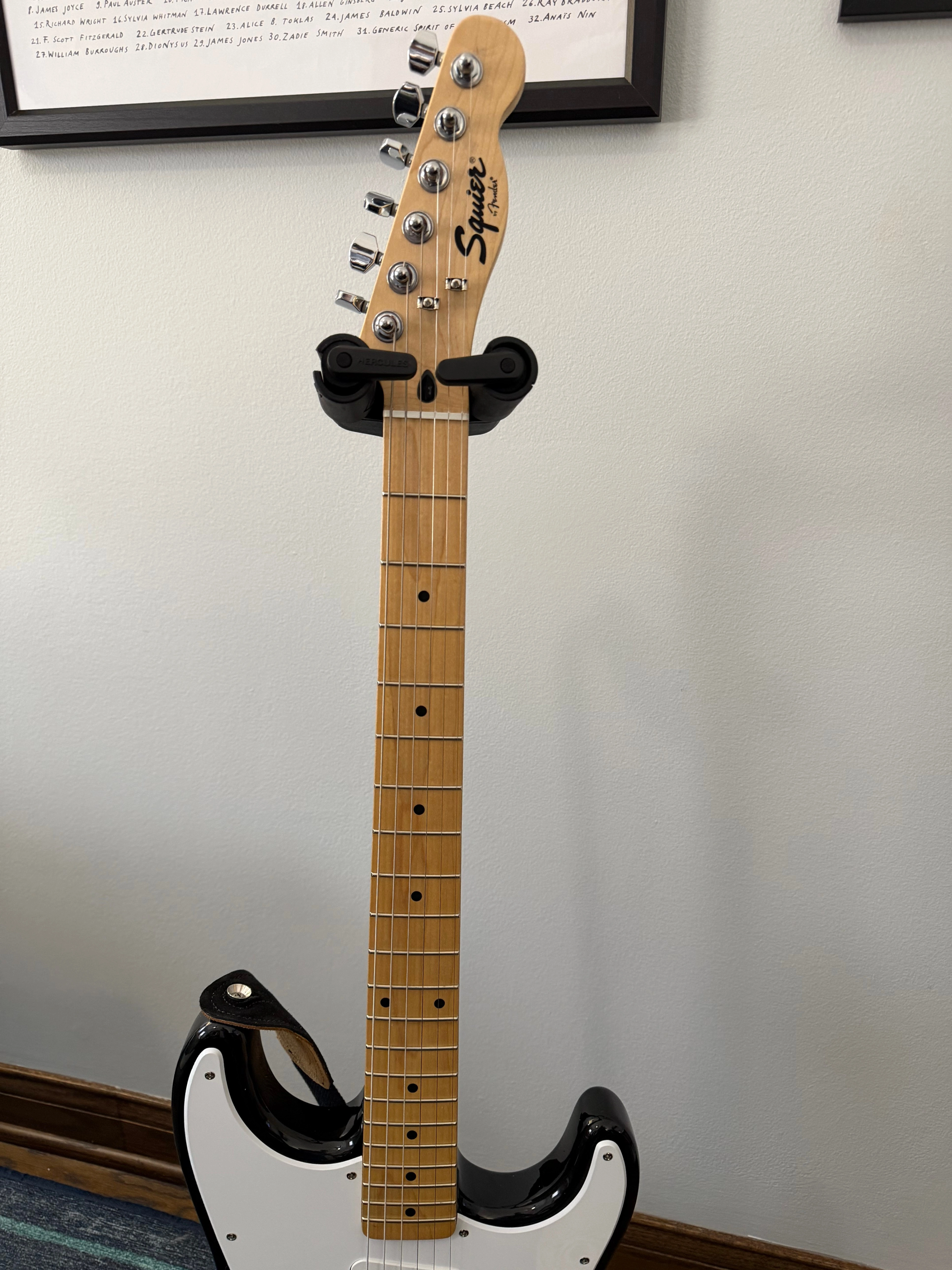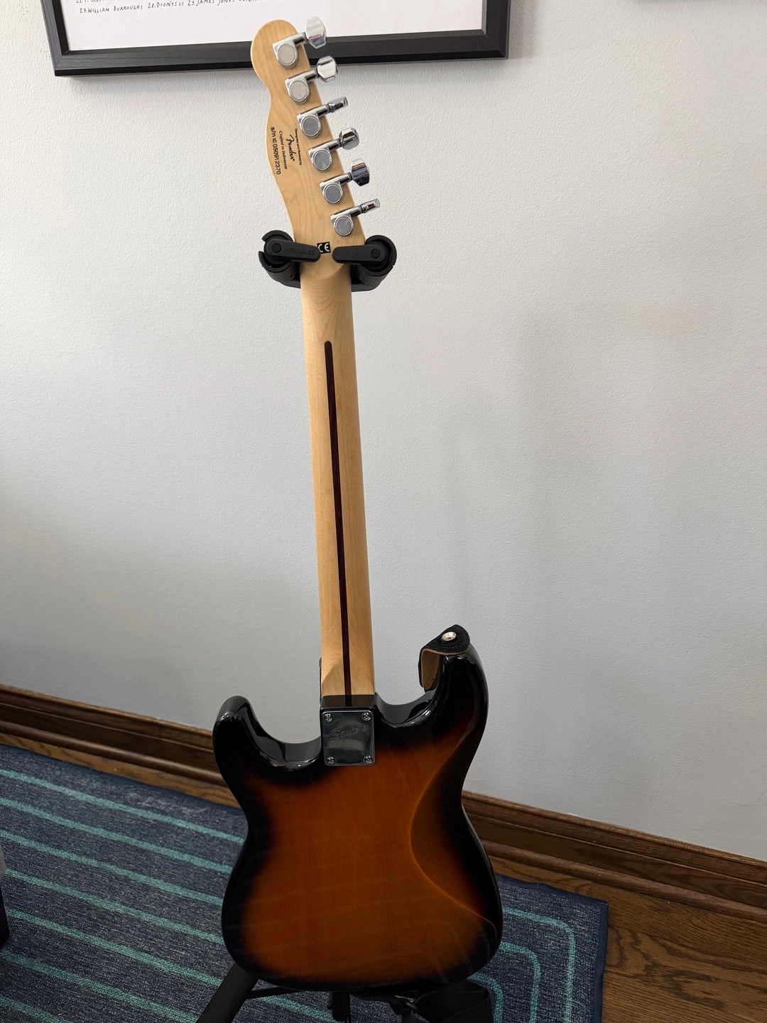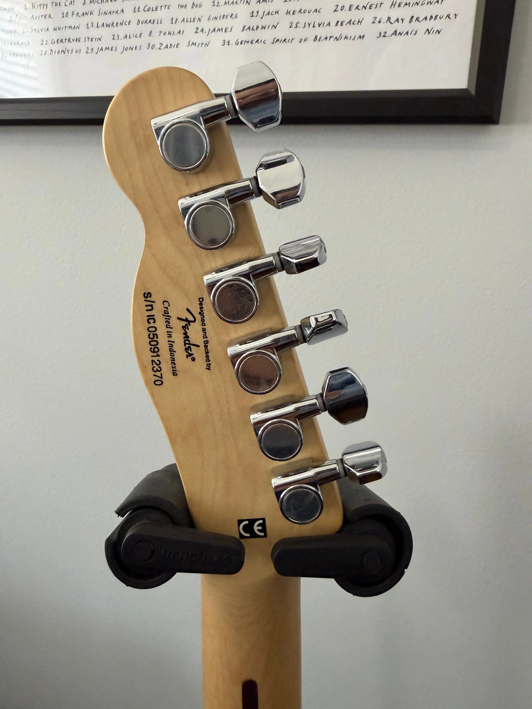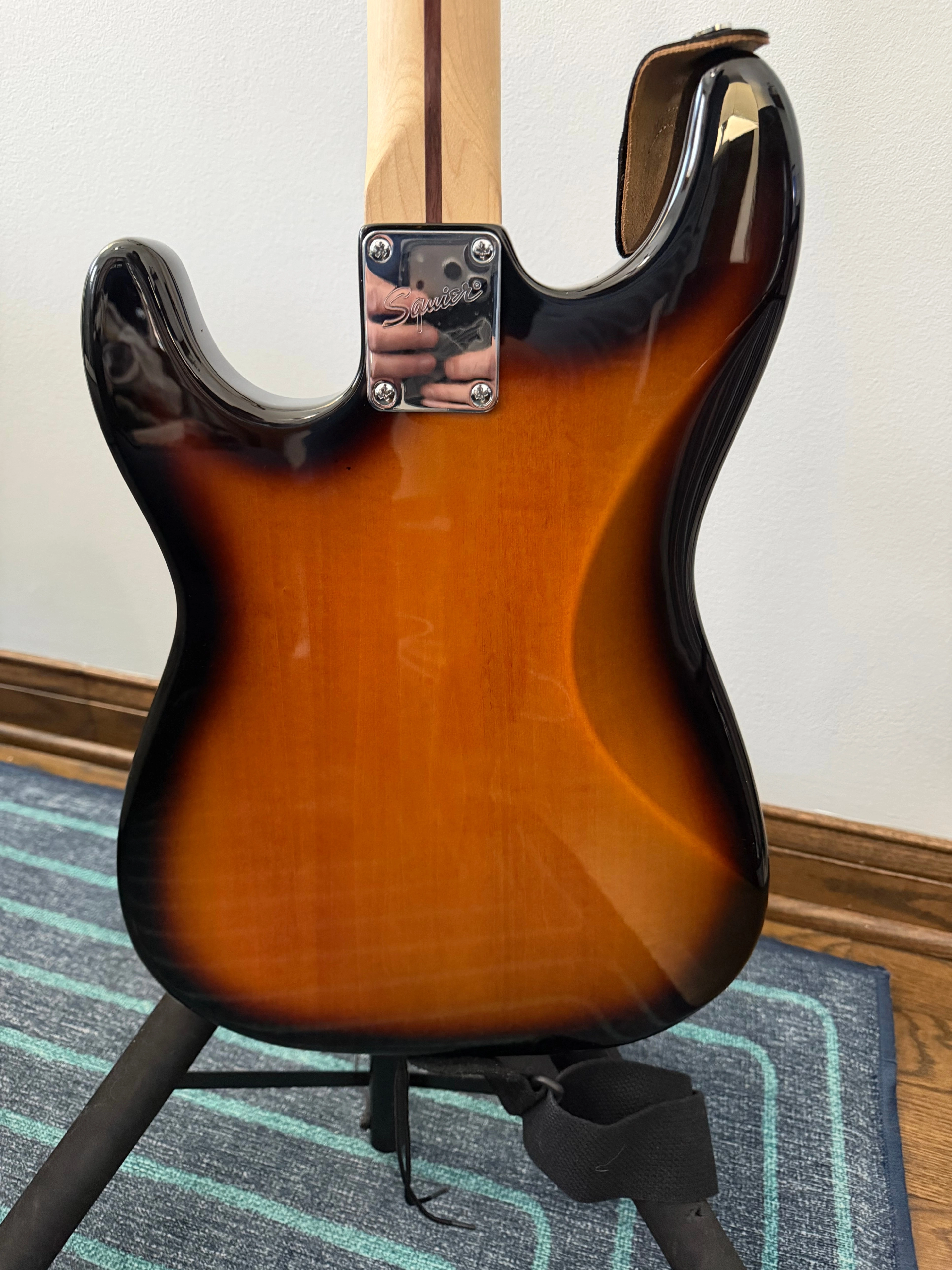 2005 made Squier `51 model. This is a unique guitar model which combines a telecaster neck, strat body, and a P-Bass style pickguard. The body is thinner, and combined with a slim neck makes playability easy.