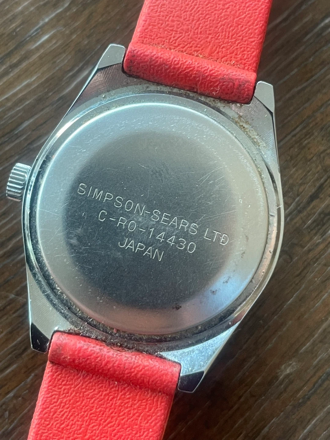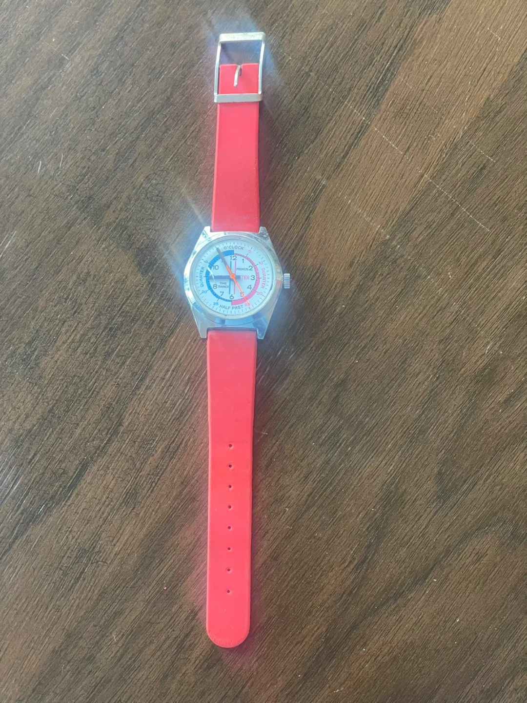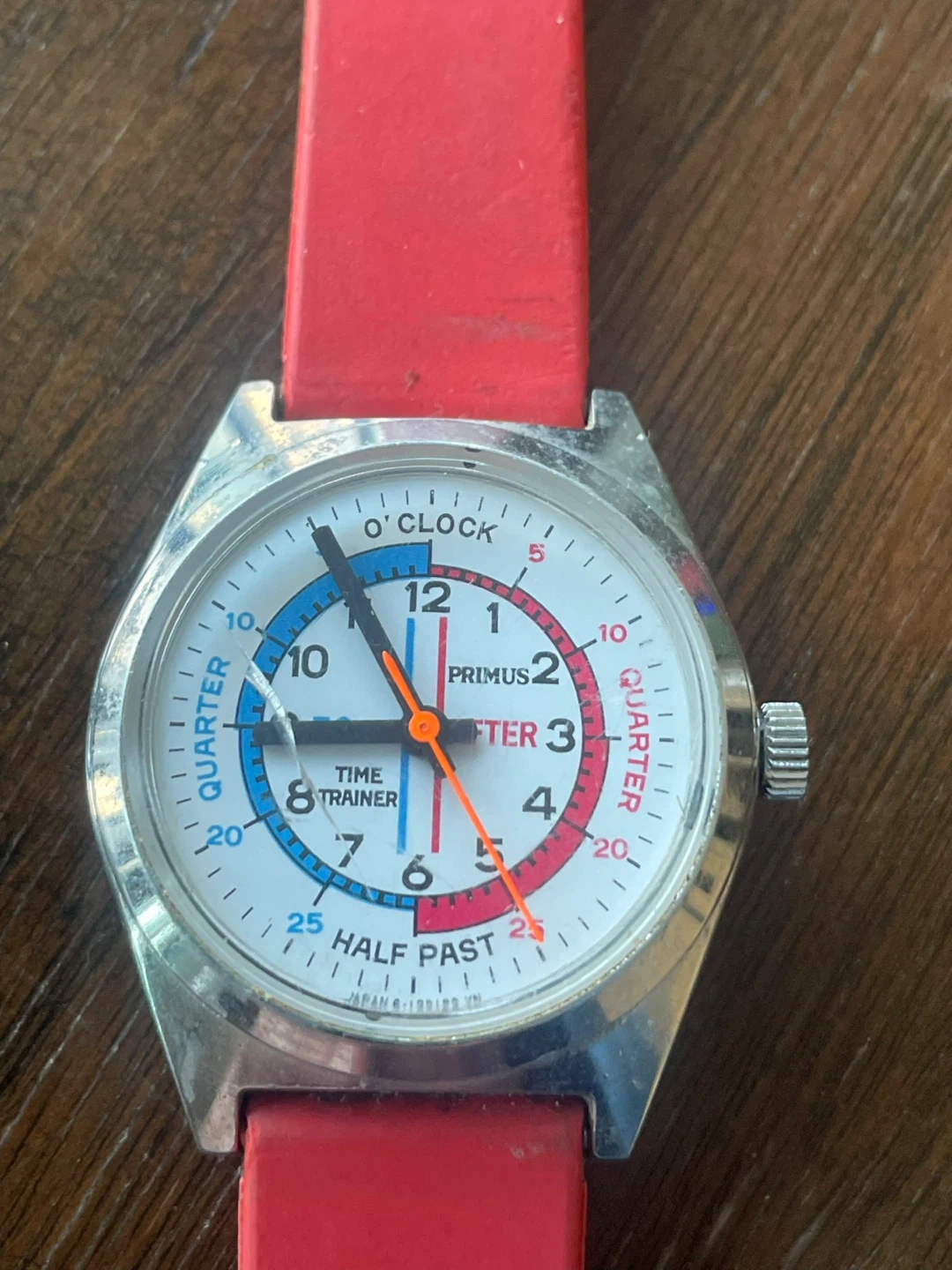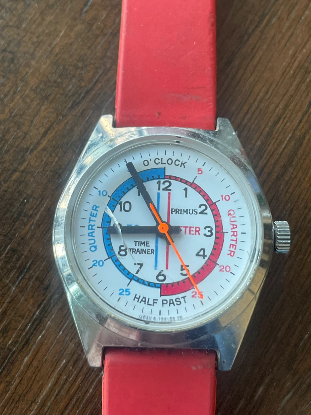 This Vintage Citron Time Trainer watch is great for learning to tell time! It has a white face with clear quarter hour markings. The red band is adjustable. Japan movement.