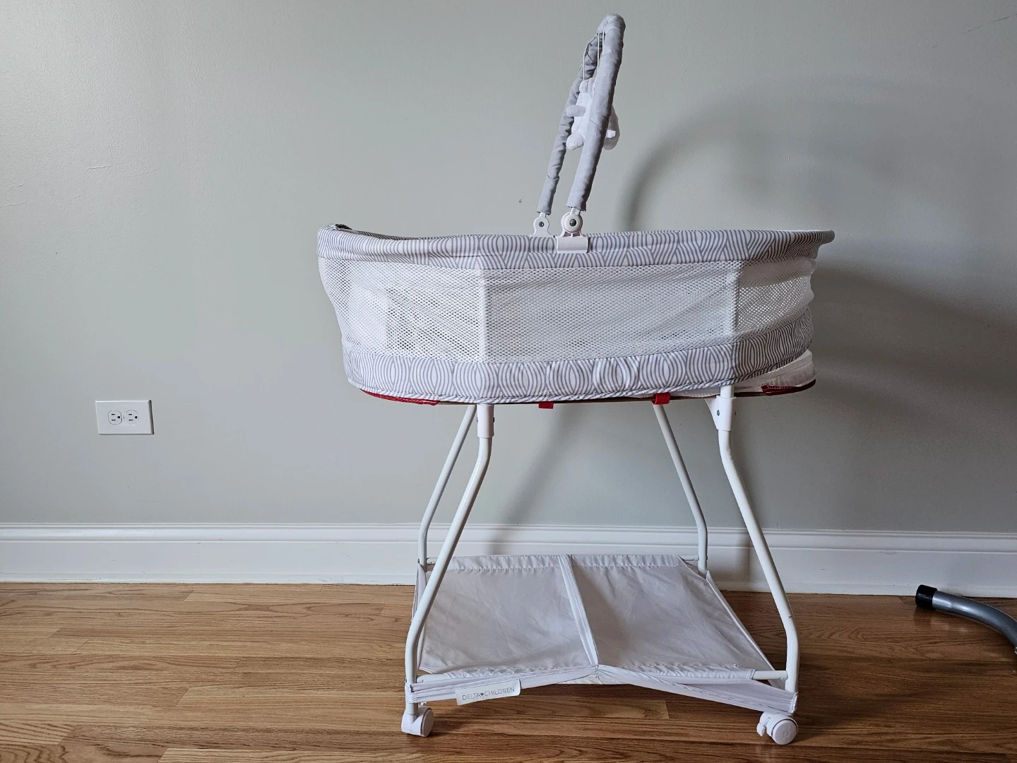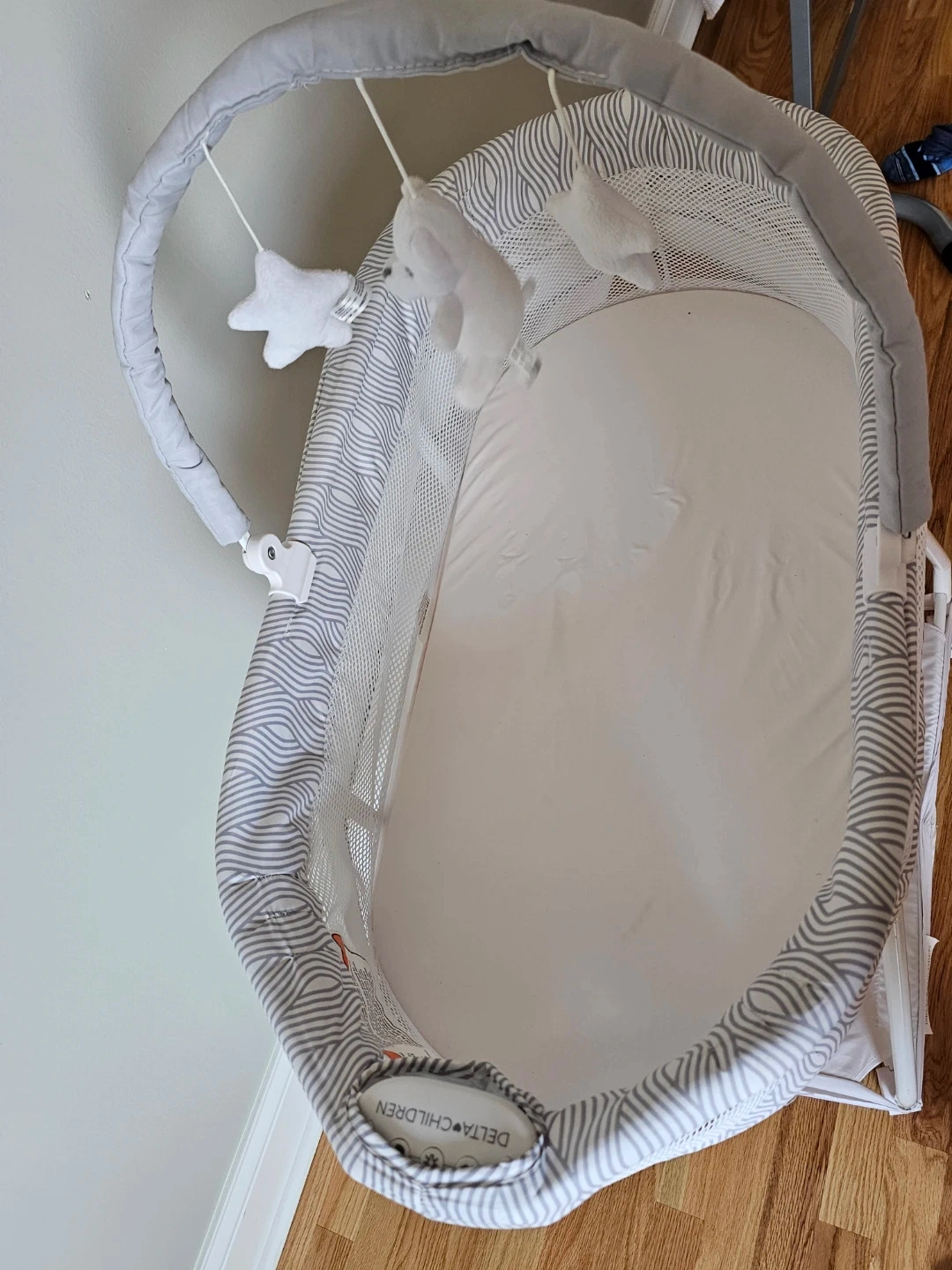 Delta Children bassinet with a gentle gray and white wave pattern. It has mesh sides for airflow and a storage shelf underneath. Includes a mobile with plush toys.