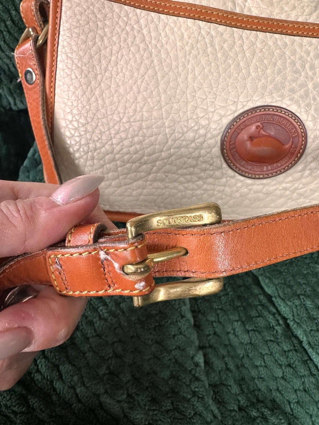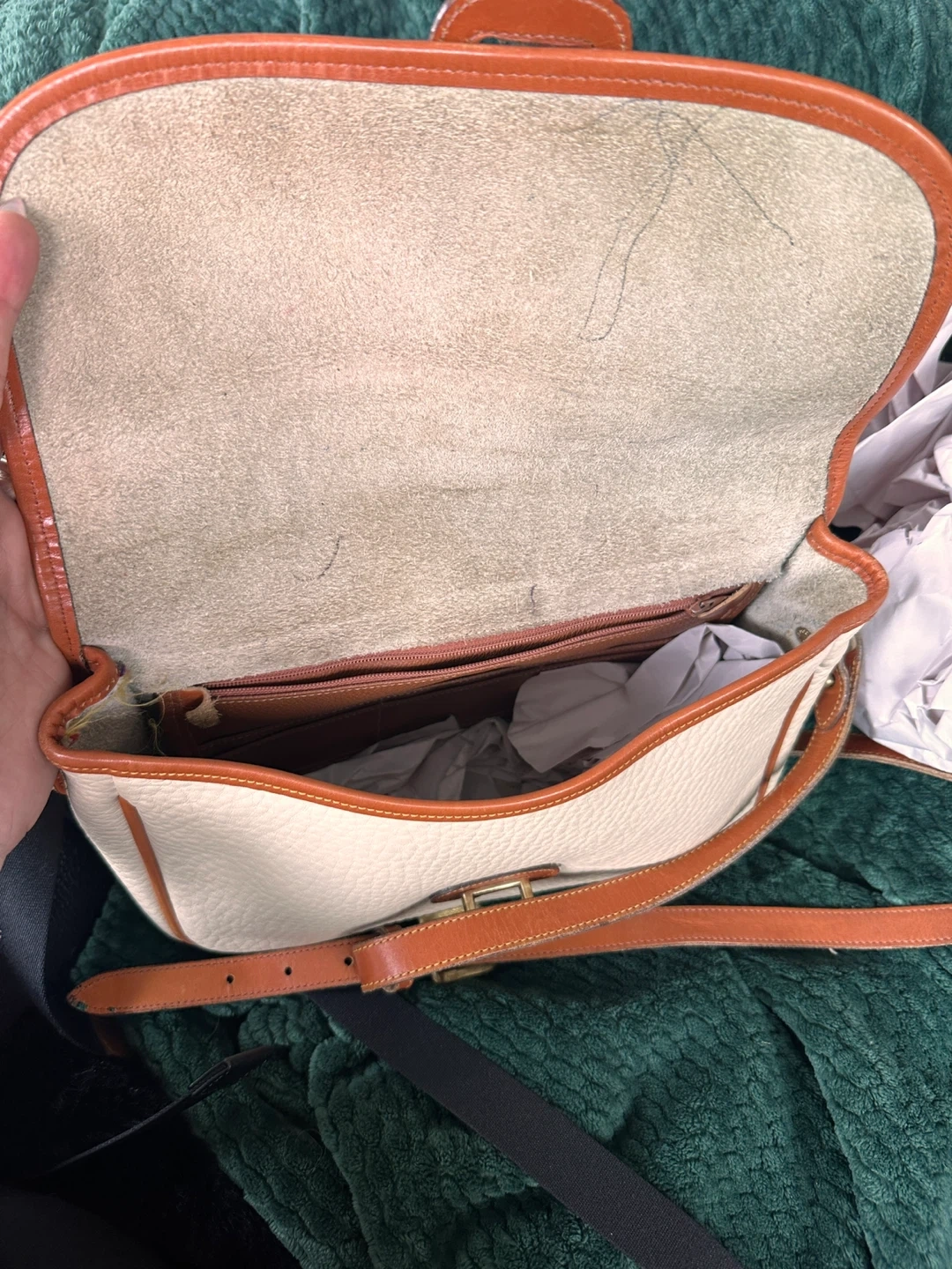 DOONEY & BOURKE All Weather Leather Off White & British Tan Crossbody Saddle Bag In excellent used condition! Hardly any wear shown! Barely Used! See Photos! Approximate Measurements: Height: 7.5" Width:10" Depth: 3.5" The hangtag is the only thing missing to this beautiful bag! Asking $160 OBO. Pickup in Etobicoke.