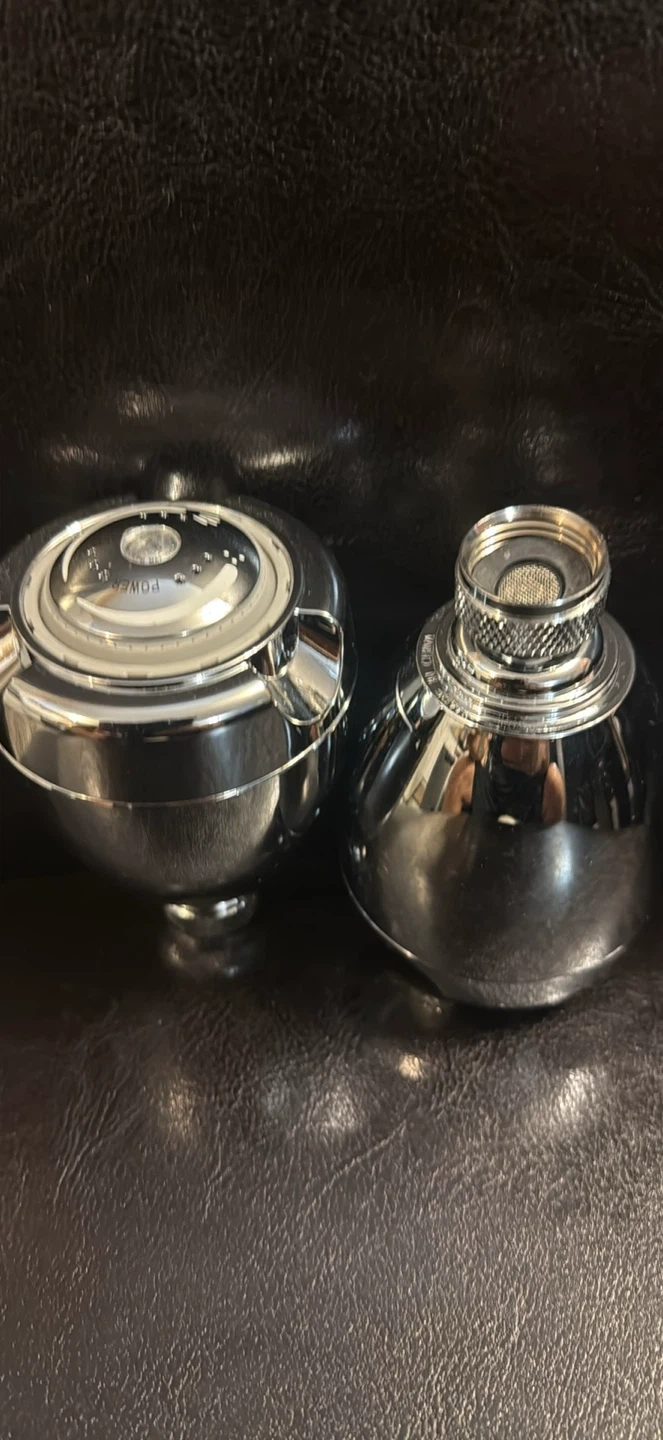 Selling a set of two chrome shower heads. These shower heads have a dial to adjust spray settings. They are made of durable plastic with a chrome finish.