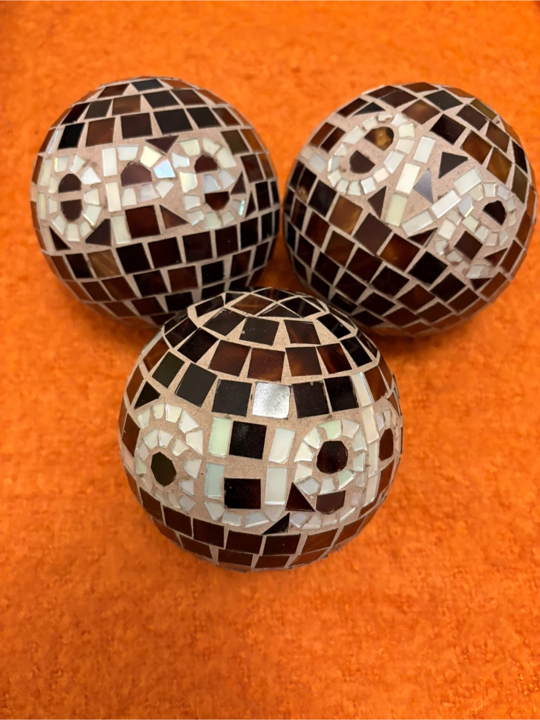 These decorative spheres have a mosaic design with brown and white tiles. They appear to be made of a ceramic or concrete base. Their spherical shape makes them versatile for display.