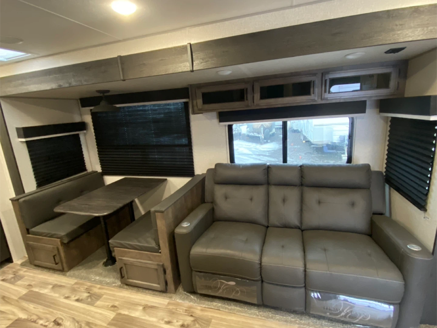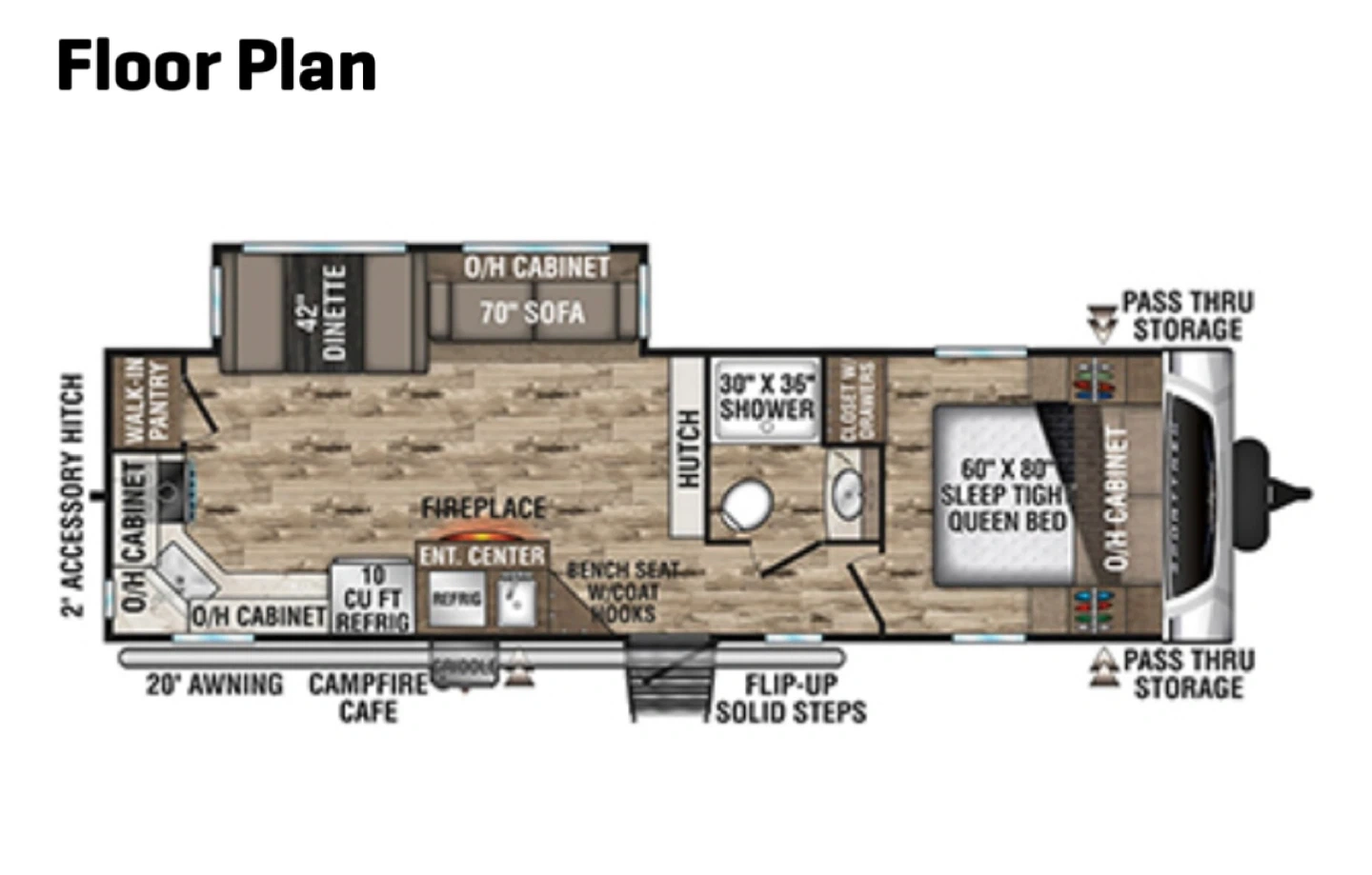 * Exterior: 3/4 fiberglass front cap with a panoramic window, 20-foot power awning, and pass-through storage.