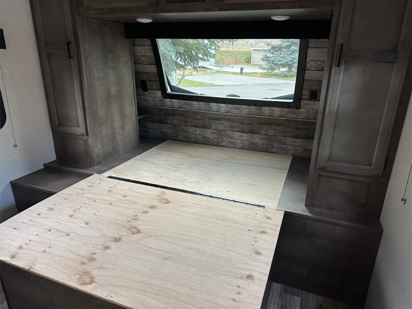 * Bedroom: Front master bedroom with a residential-size 60" x 80" queen bed, storage underneath and "Store More”nightstands with USB/110V outlets.