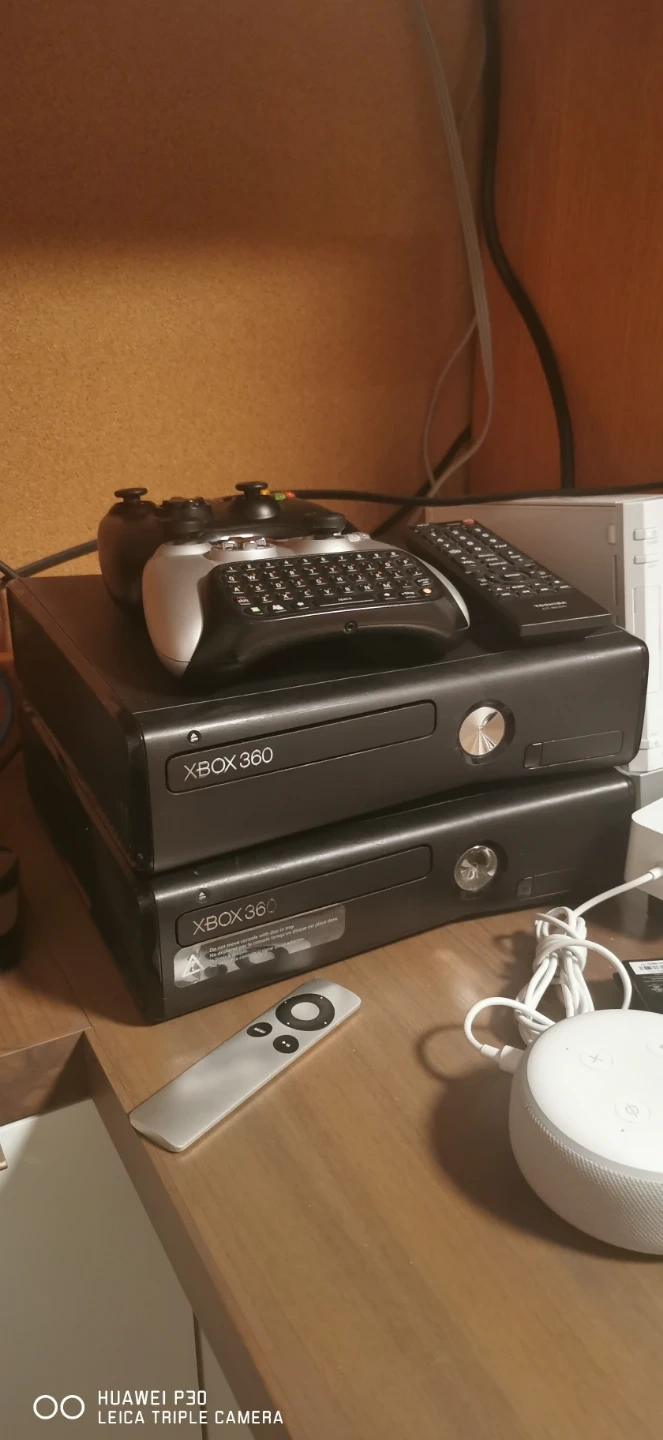 Two black Xbox 360 consoles are stacked. 50 for both, Accessories include two controllers, one with a keyboard attachment and all cable. no games.