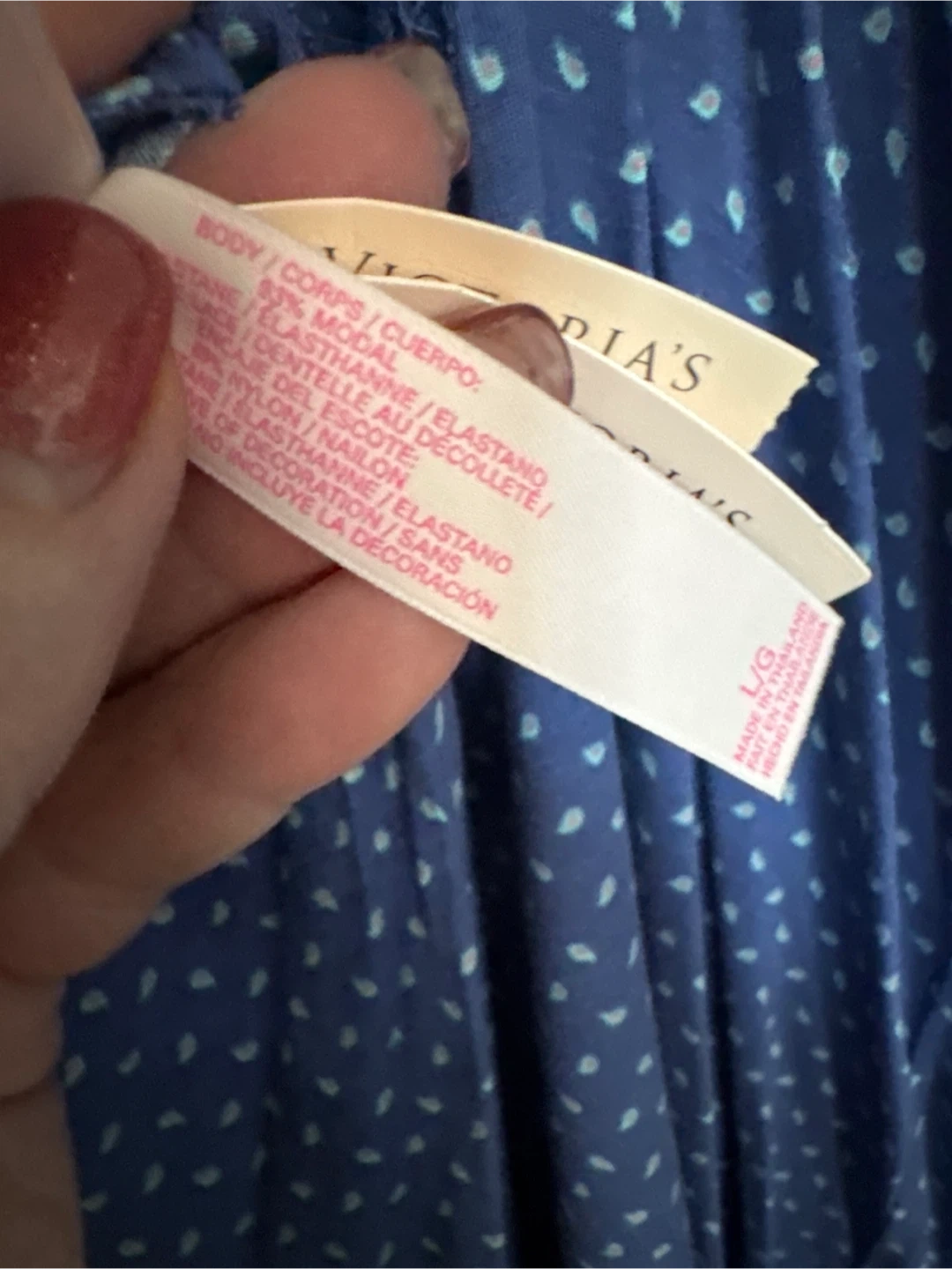 Victoria's Secret blue camisole with a polka dot pattern and lace trim. It's size L/G. Body is 83% modal, 17% elastane, with nylon/elastane decoration. Great for loungewear!