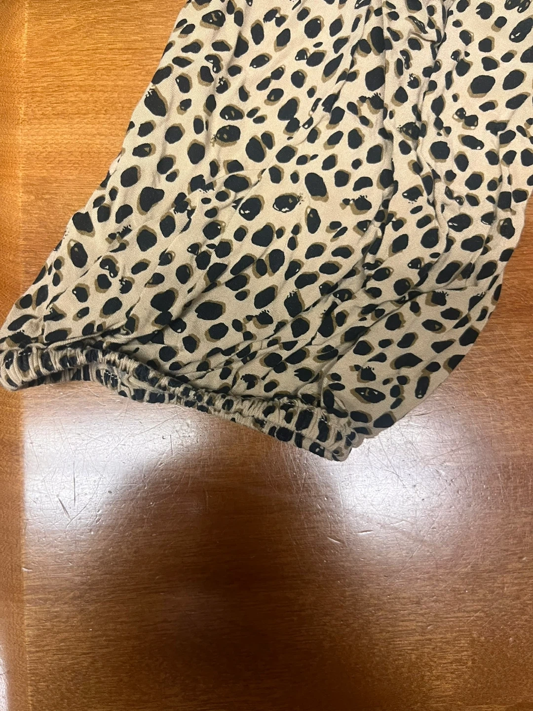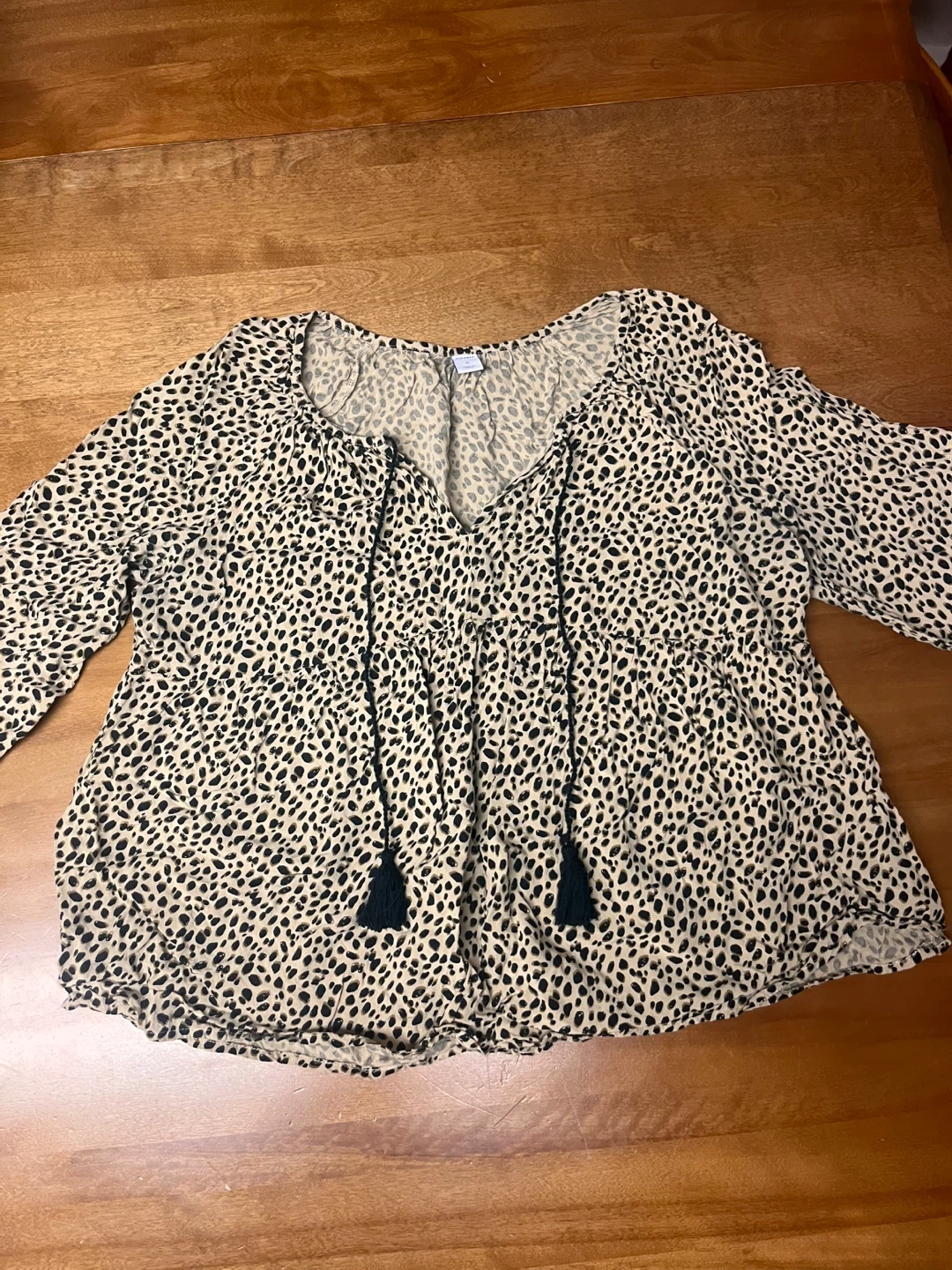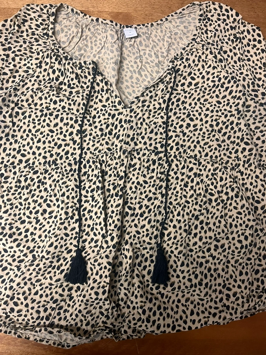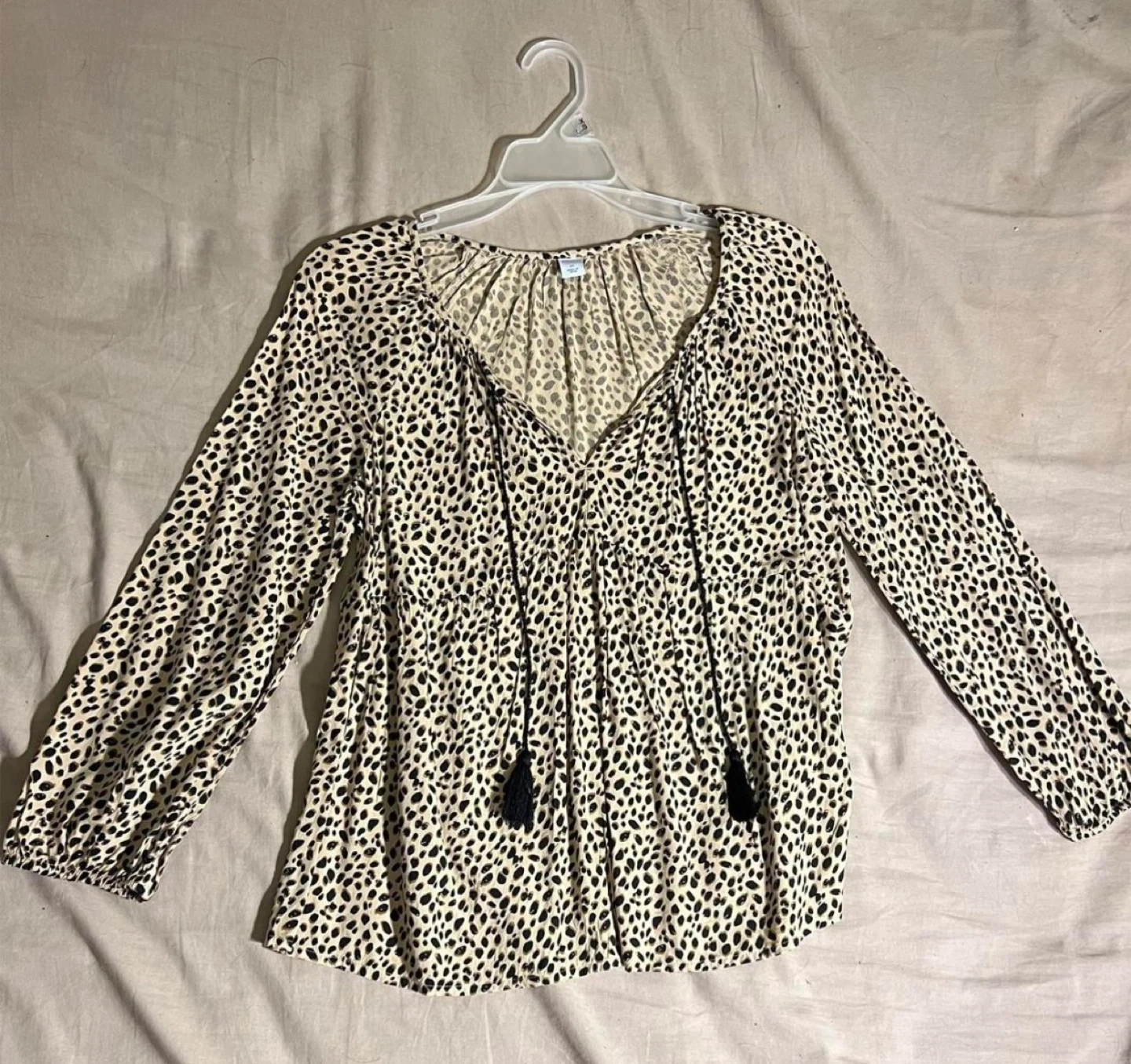This Old Navy top features a beige and black leopard print. It's a size medium with a V-neck and tie details. The material is lightweight for comfortable wear.