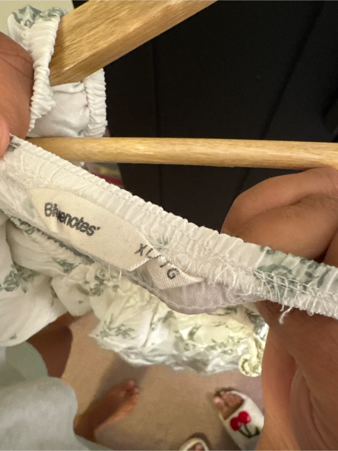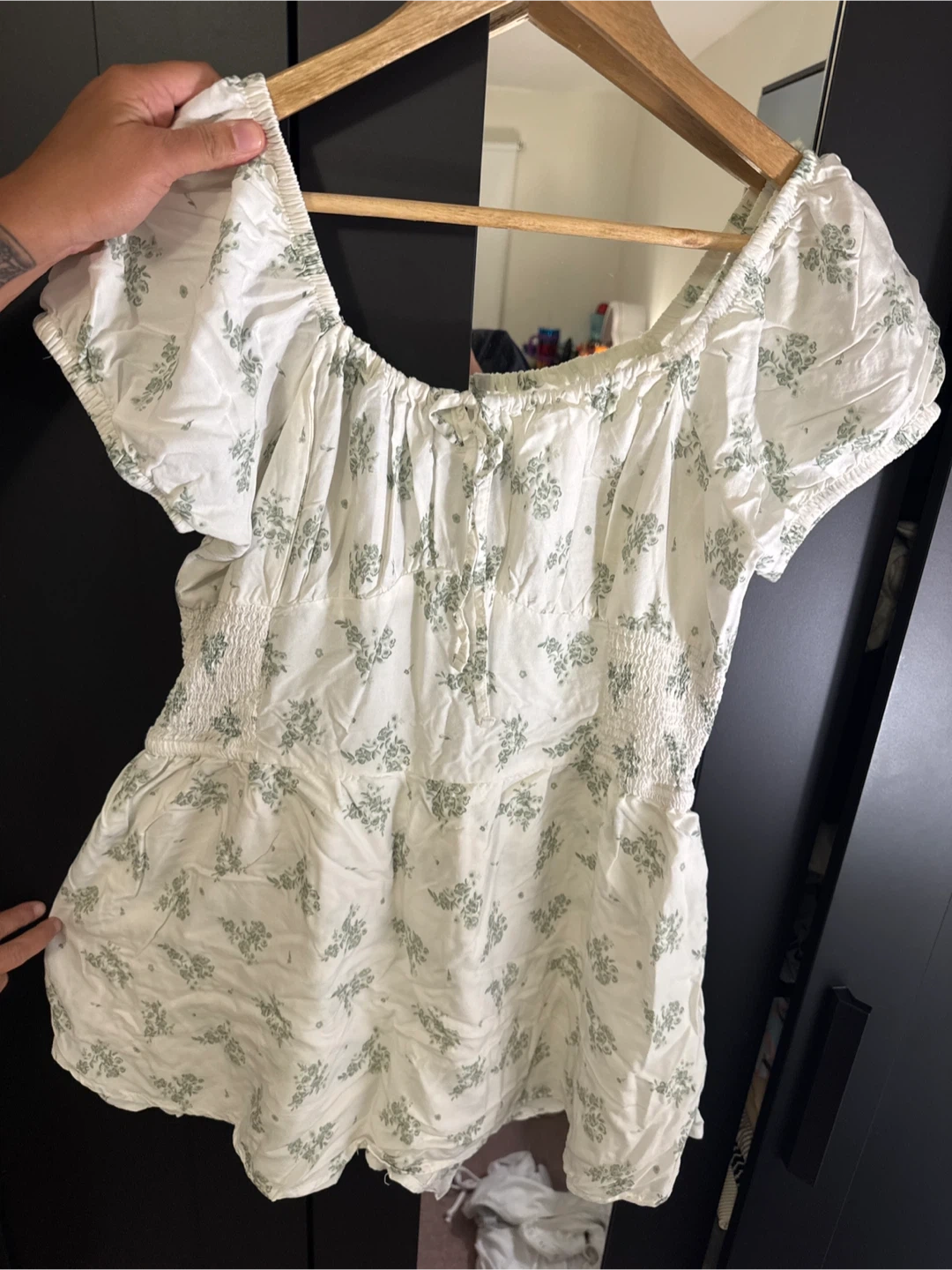 This is a Bluenotes peasant top with a ditsy floral print. It features a shirred bodice and puff sleeves. Size is XL.