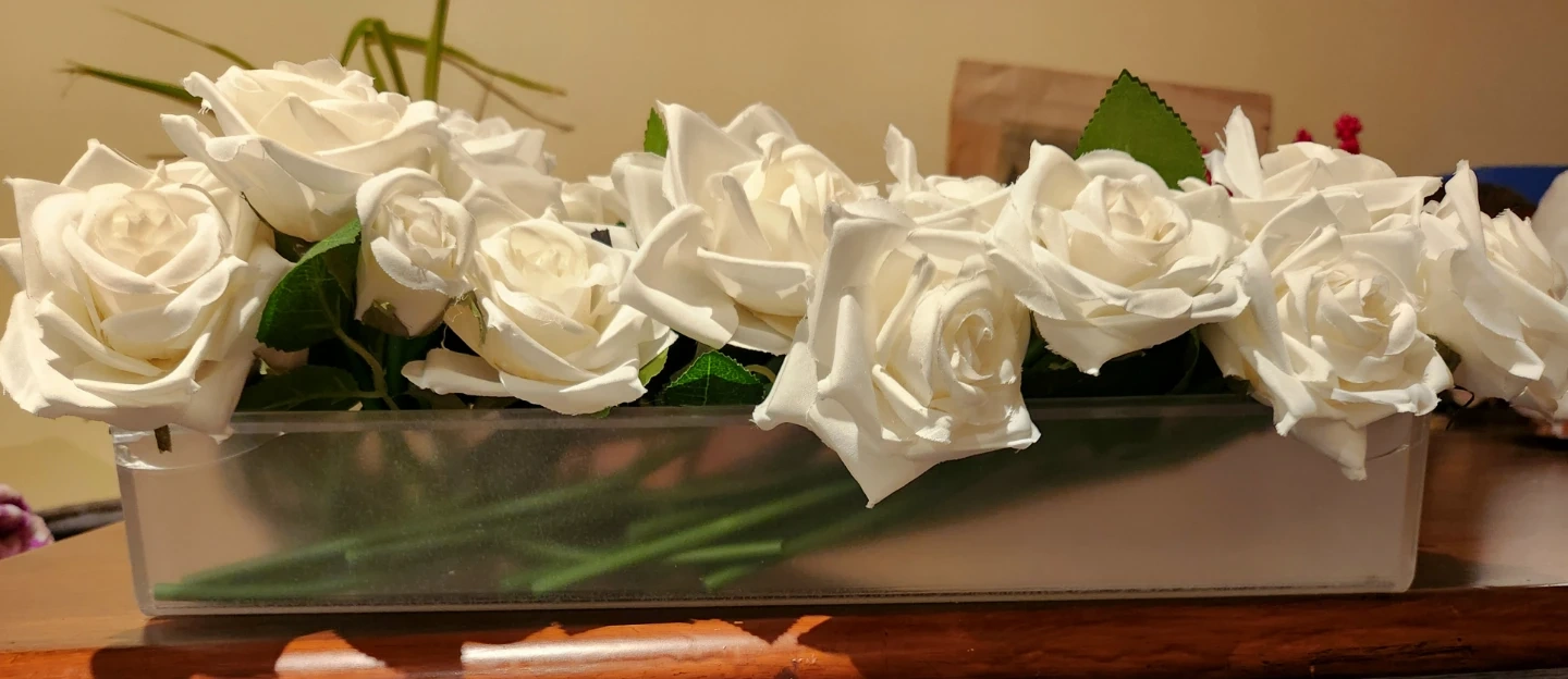 A faux floral arrangement featuring numerous white roses in a clear rectangular box. Great as a centerpiece for outdoor informal weddings or other special occasions.
