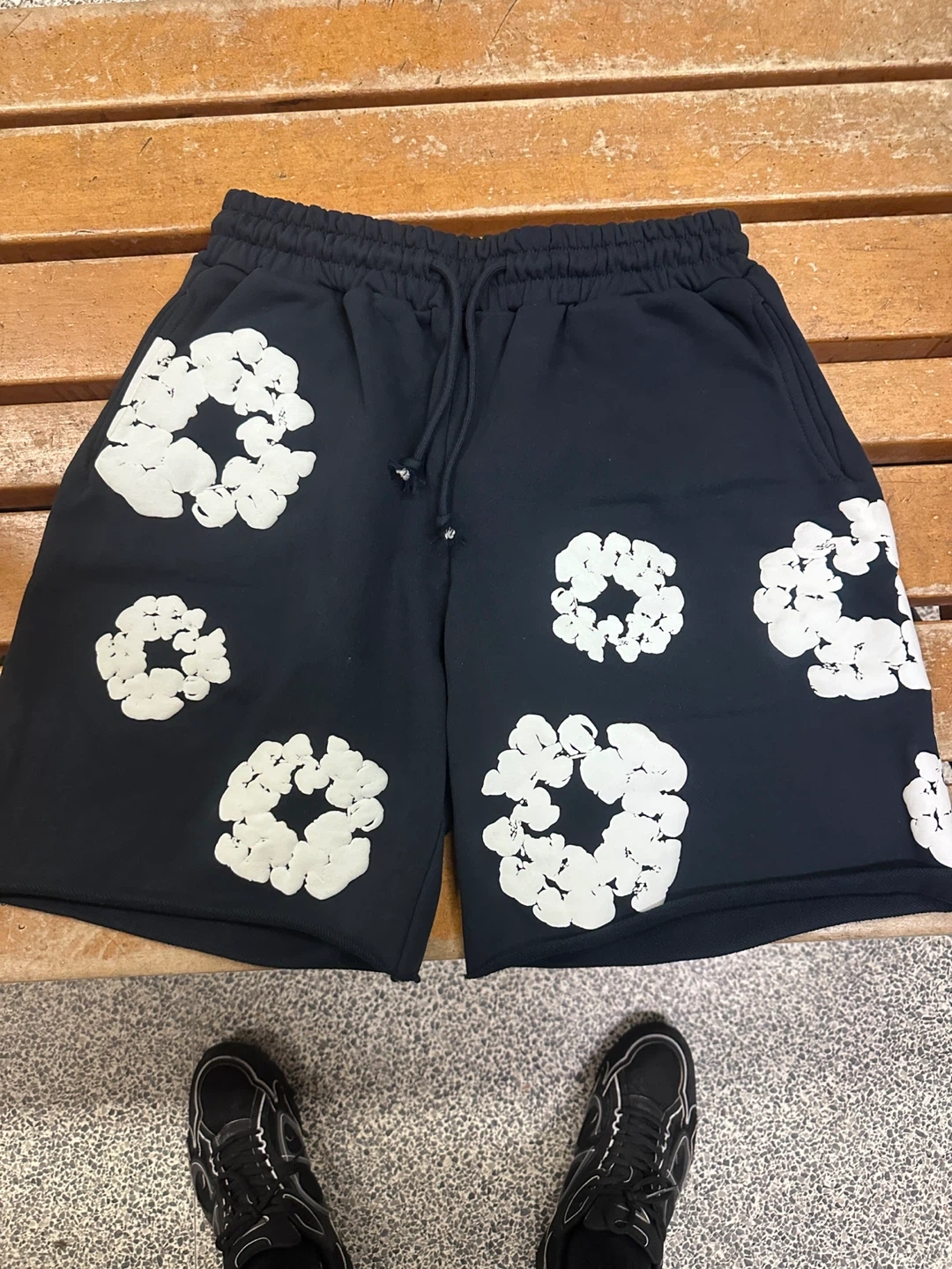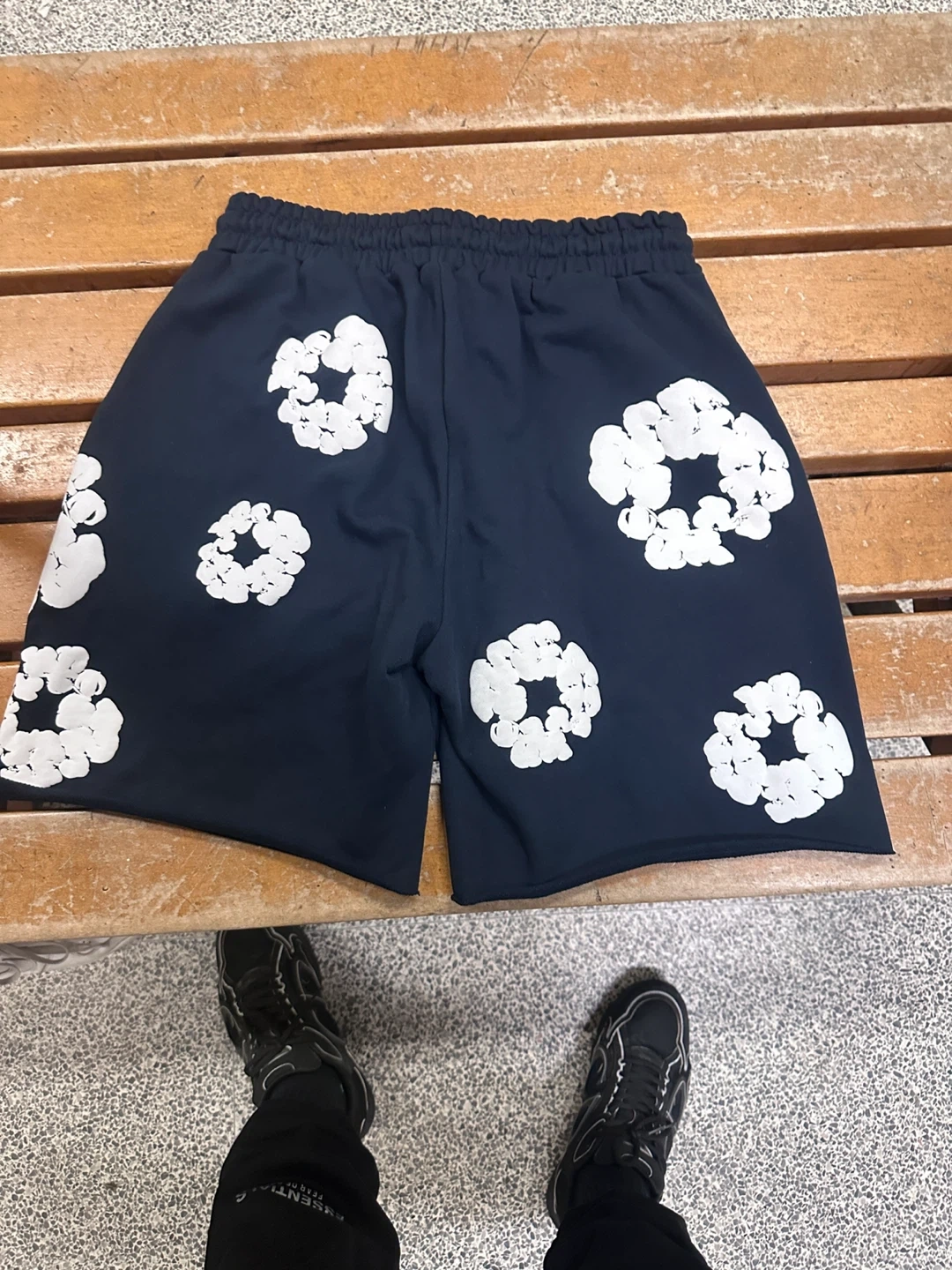 These navy shorts feature a unique white floral print all over. They're made with a comfortable sweat-like material and have an elastic waistband with a drawstring. Size is medium. Made in Portugal.