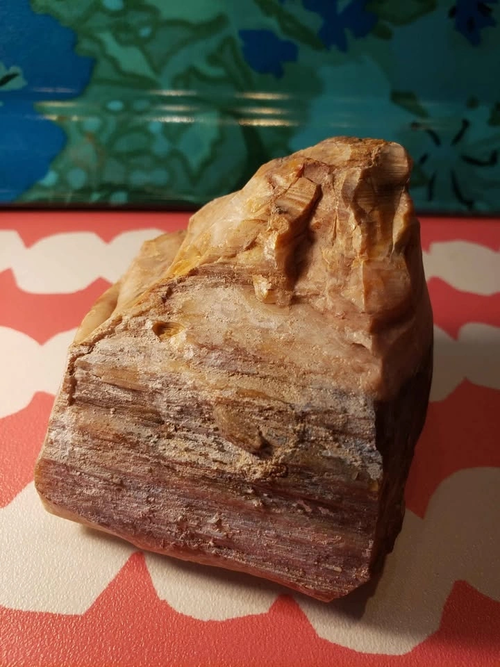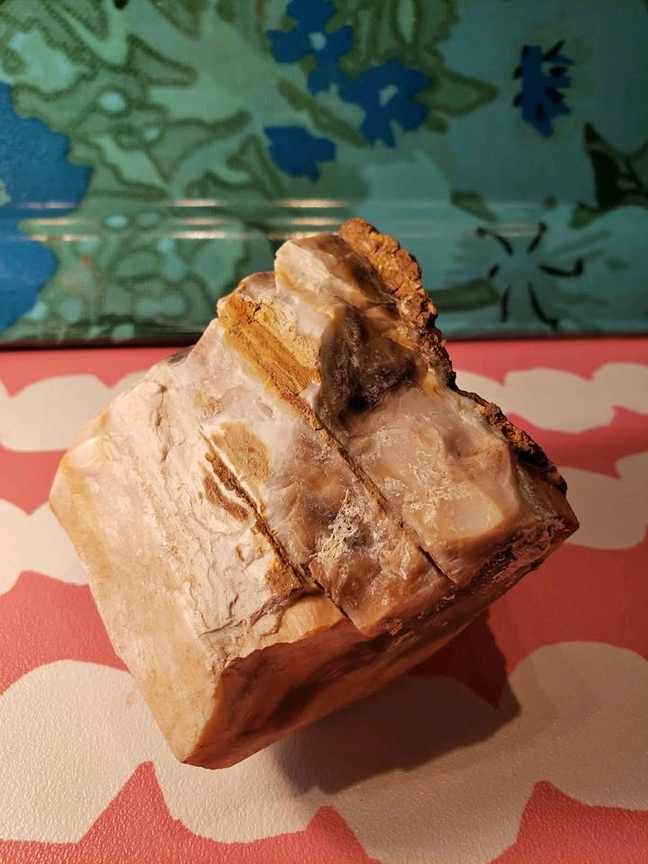 Beautiful natural stone with warm tones in the banding. Semi-translucent in areas with unique layered patterns. Solid but not overly heavy — perfect for a desk, bookshelf, or decorative accent. One-of-a-kind piece. Approx. 8 cm x 6 cm x 6 cm. 350g.