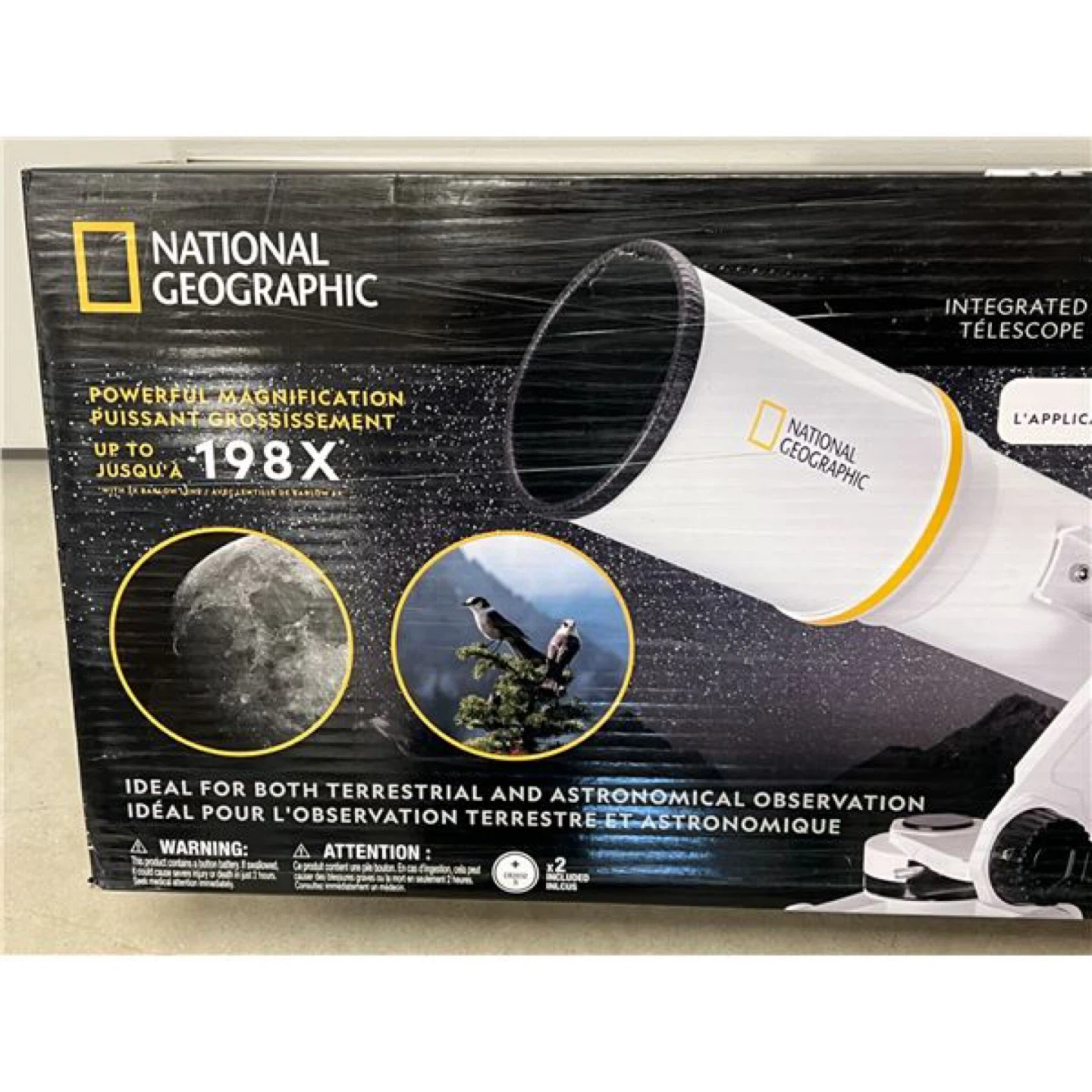 National Geographic integrated telescope with powerful magnification up to 198X. It's ideal for both terrestrial and astronomical observation. Includes 2 included accessories.