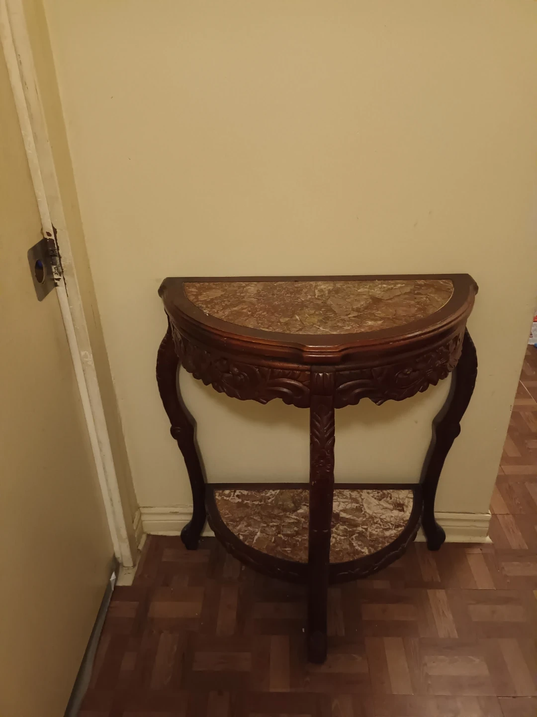 Selling a lovely half-moon accent table with a marble top. It's in great shape and would look perfect in an entryway or living room. The dark wood finish and carved details add a touch of elegance to any space